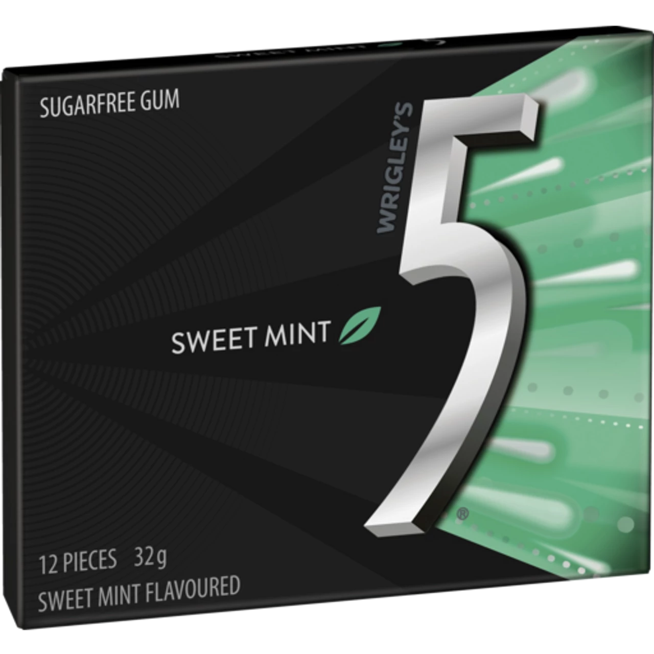 5 Gum Sweet Mint. Wrigleys sweet mint flavoured sugar free gum. 10 packs x 32g. 12 pieces per pack. Wrigleys chewing gum.