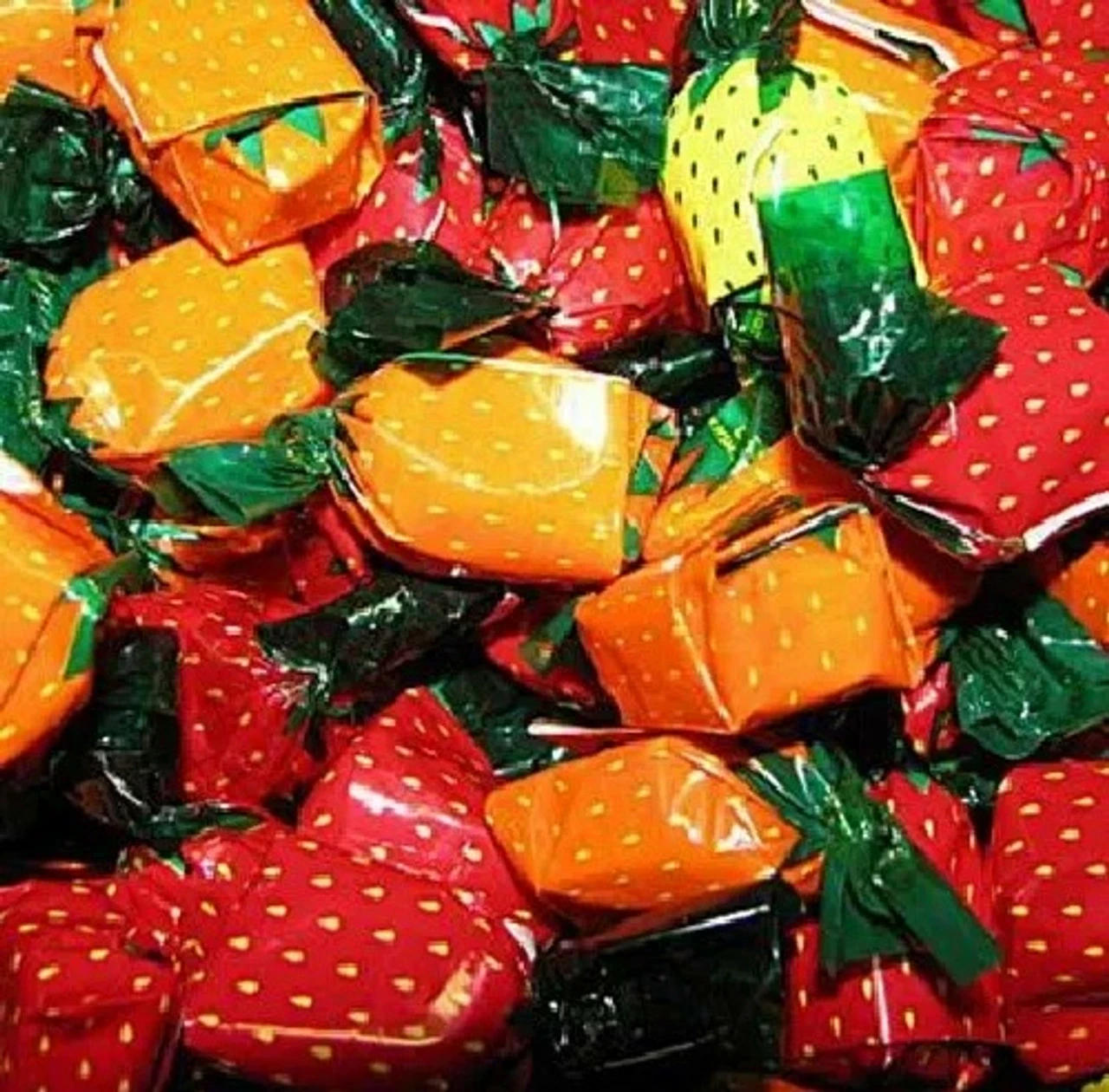 Assorted Fruits Filled are strawberry, lemon or orange flavoured hard candies. 1kg bag. Individually wrapped.