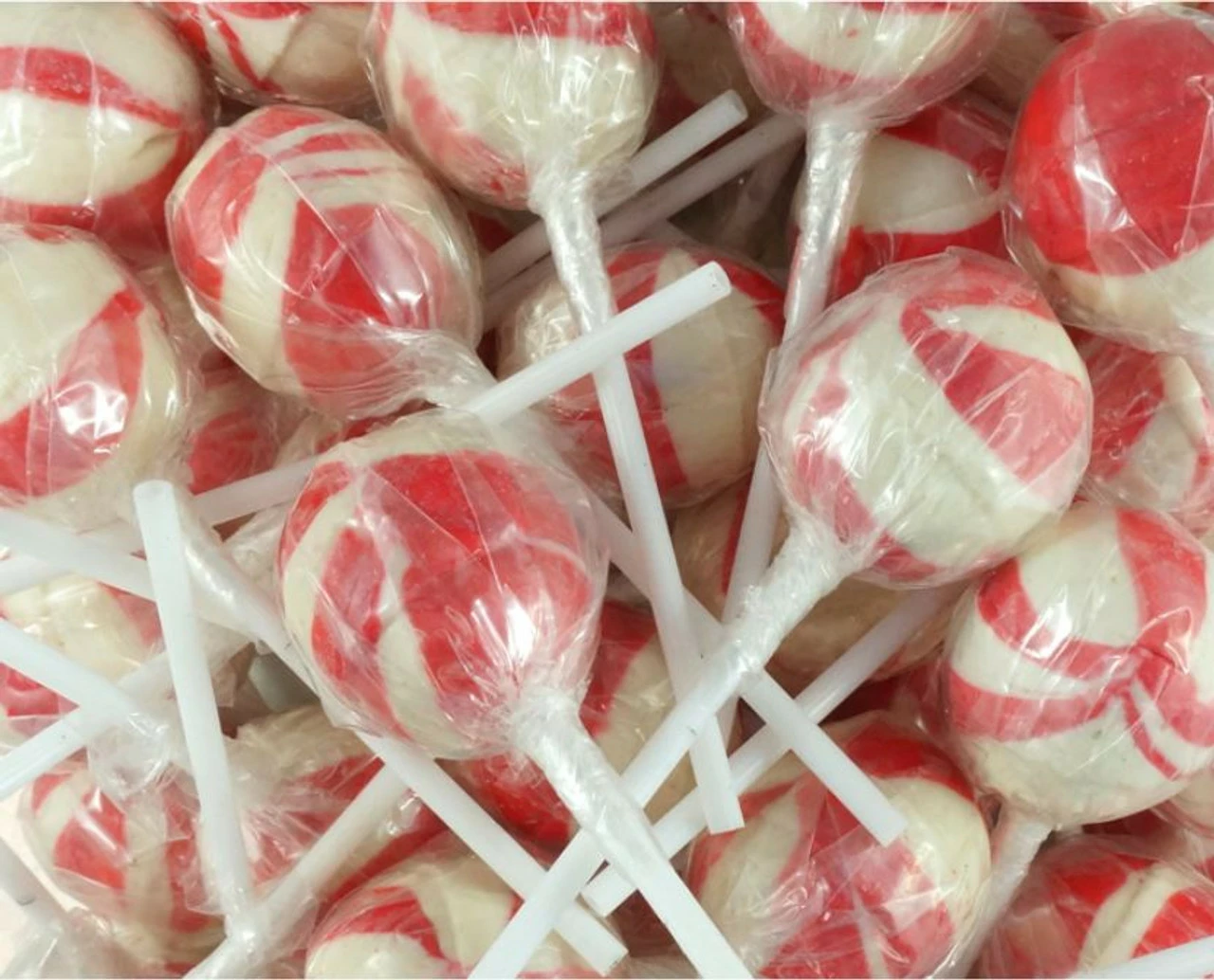 Red ball Lollipop with red & white swirls. Cherry flavour. Approx. 50 x 20g lollypops. Great for parties, colour buffets etc. Individually wrapped
