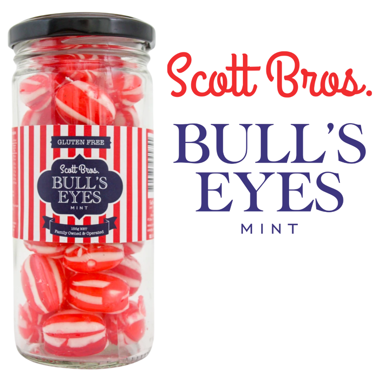 Bull’s Eye 155g are the old school traditional mint flavour you remember and loved so well. Hard Candy. Made by Scott Bros. in a recylable glass jar to maintain the best possible freshness. Gluten Free. Made in Australia.