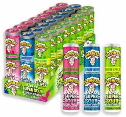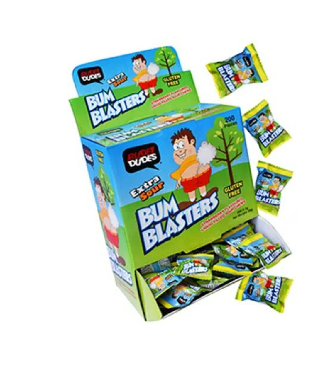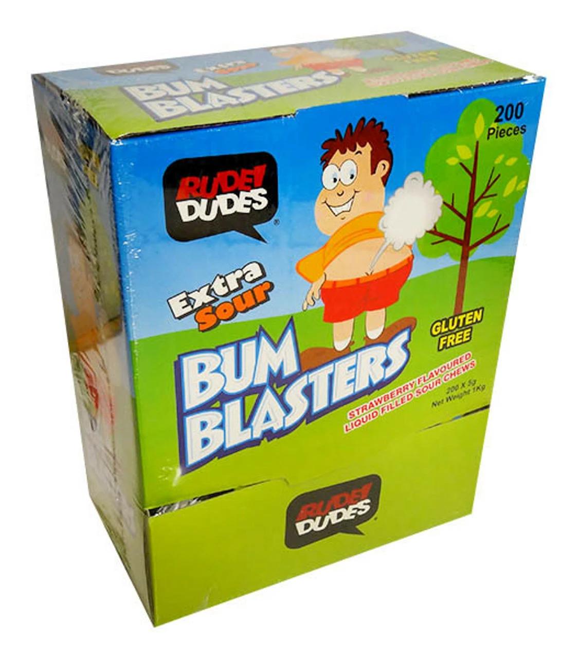 Bum Blasters are extra sour strawberry flavoured liquid filled sour chews. Rude Dudes are gluten free and individually wrapped with each box containing approximately 200 pieces.