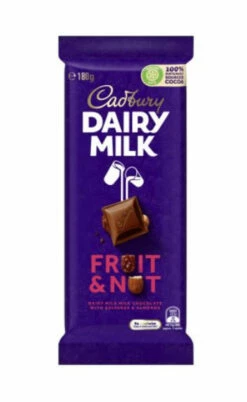 Cadbury Fruit & Nut block is a delightful mixture of almonds and sultanas covered in Australia’s favourite Dairy Milk chocolate. 14 x 180g blocks per box.