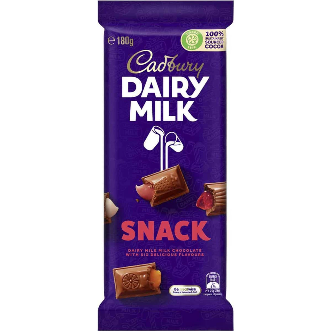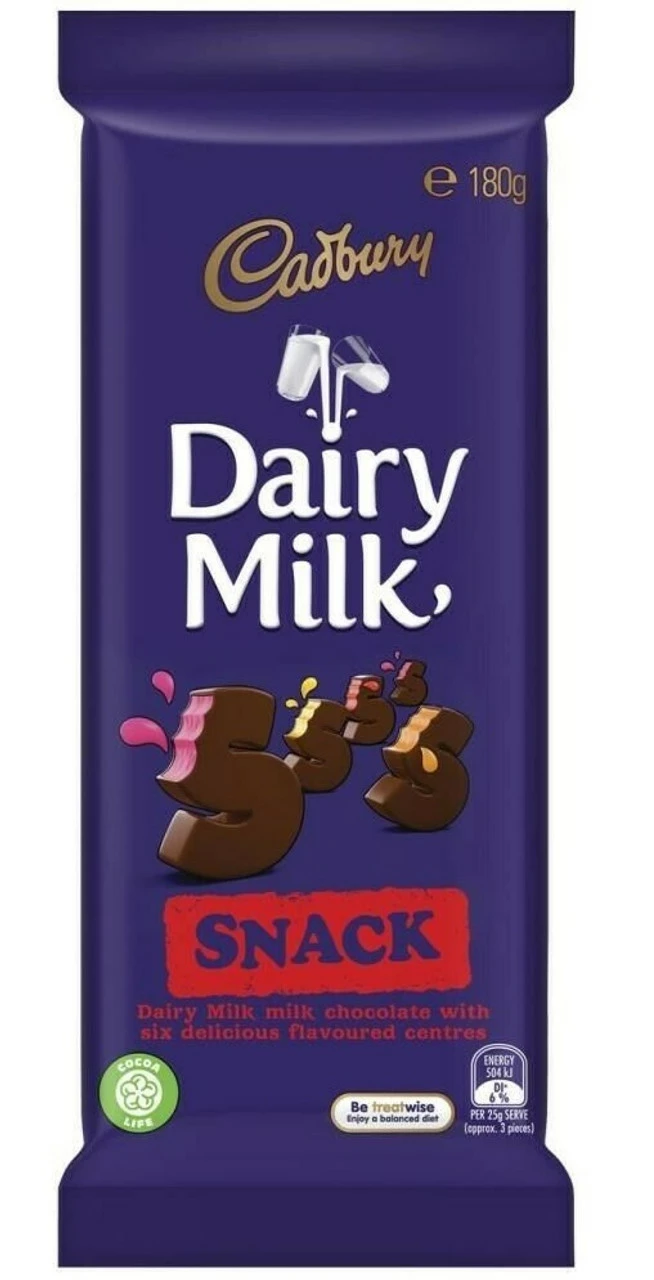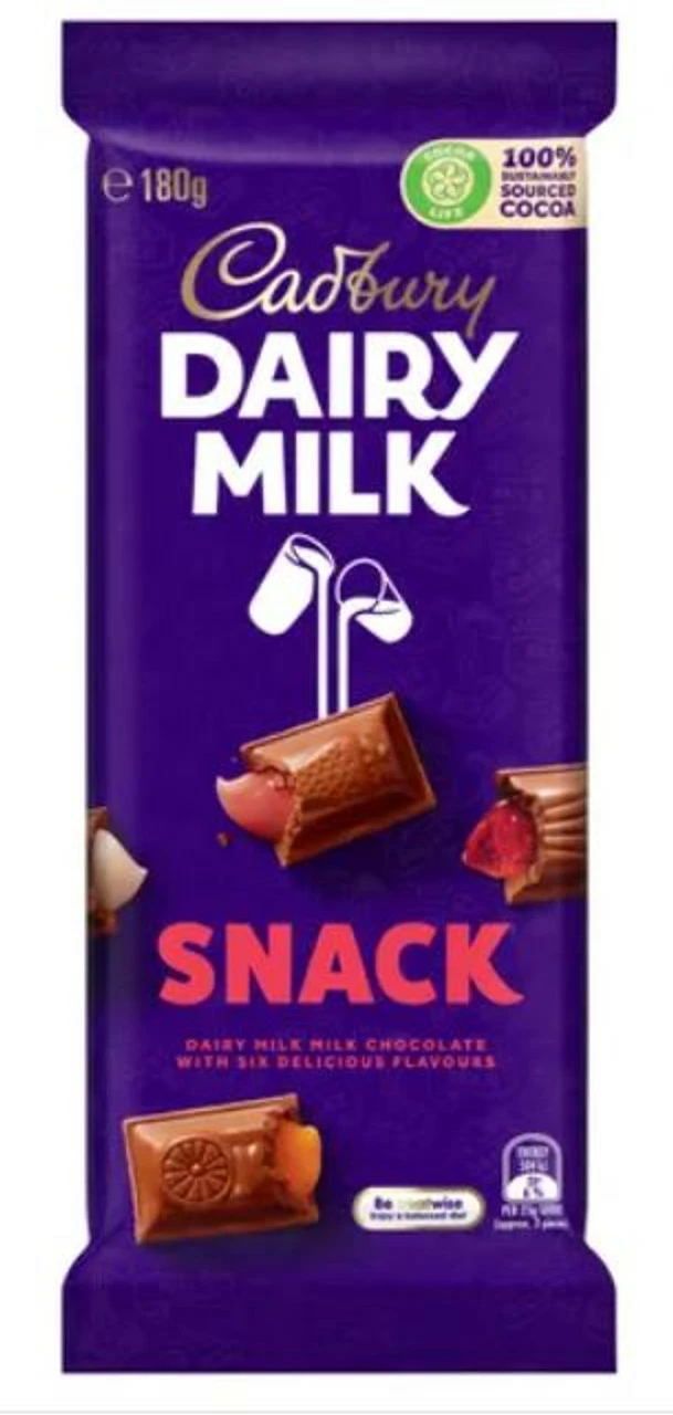 Cadbury Dairy Milk Snack 180g chocolate block. 6 delicious flavoured centres covered with Cadbury Dairy milk chocolate. Strawberry, pineapple, orange, coconut ice, turkish delight and caramel.