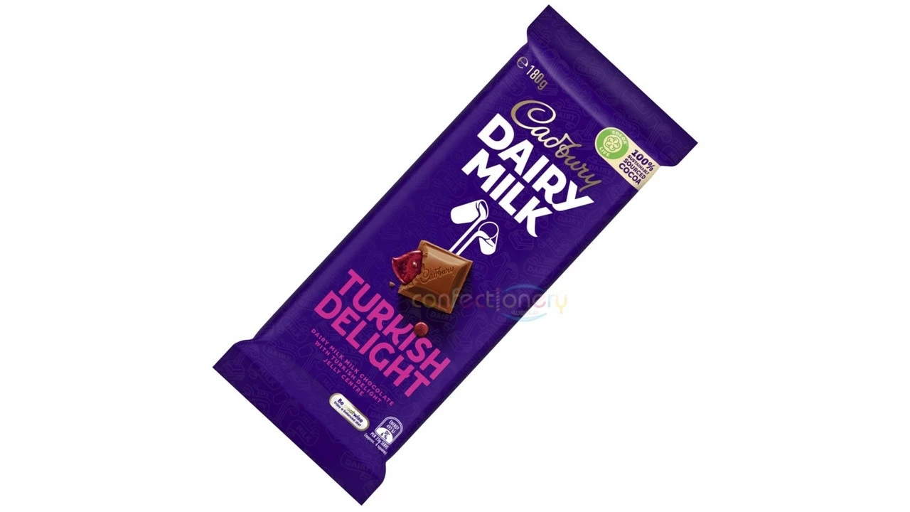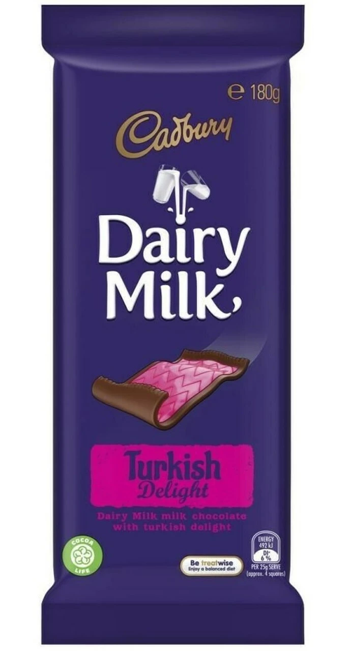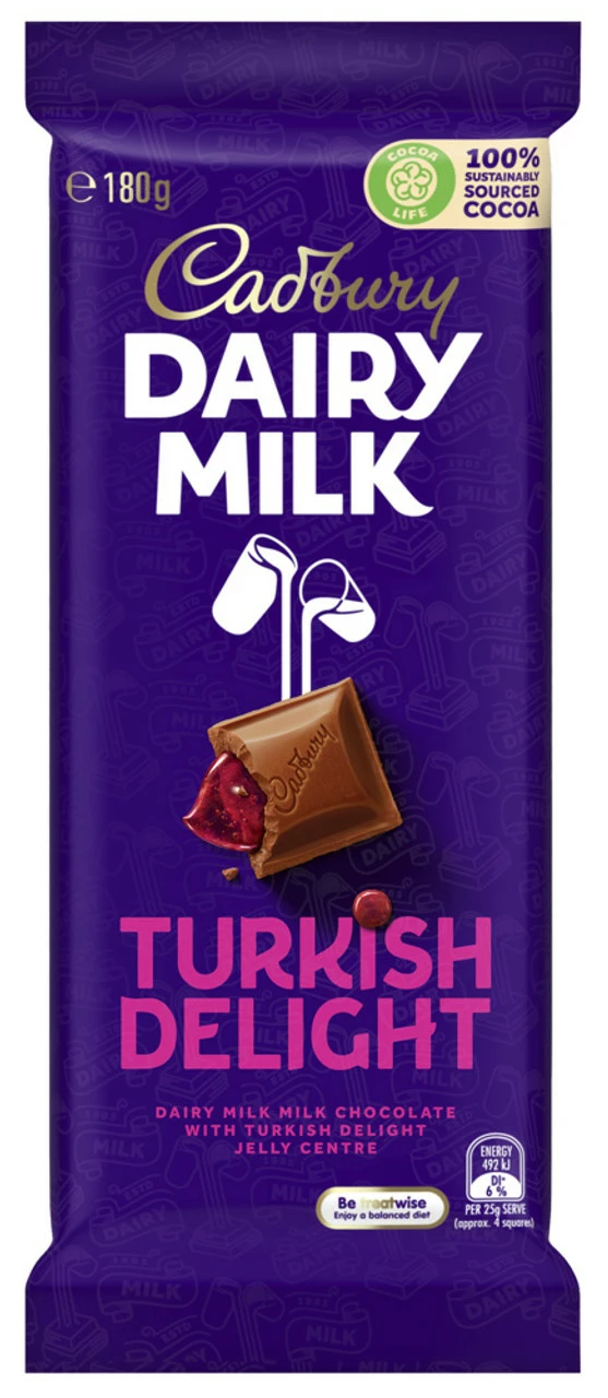 Cadbury Turkish Delight block is a blend of Turkish Delight jelly covered in Dairy Milk Chocolate. 180g bar. Made in Australia.