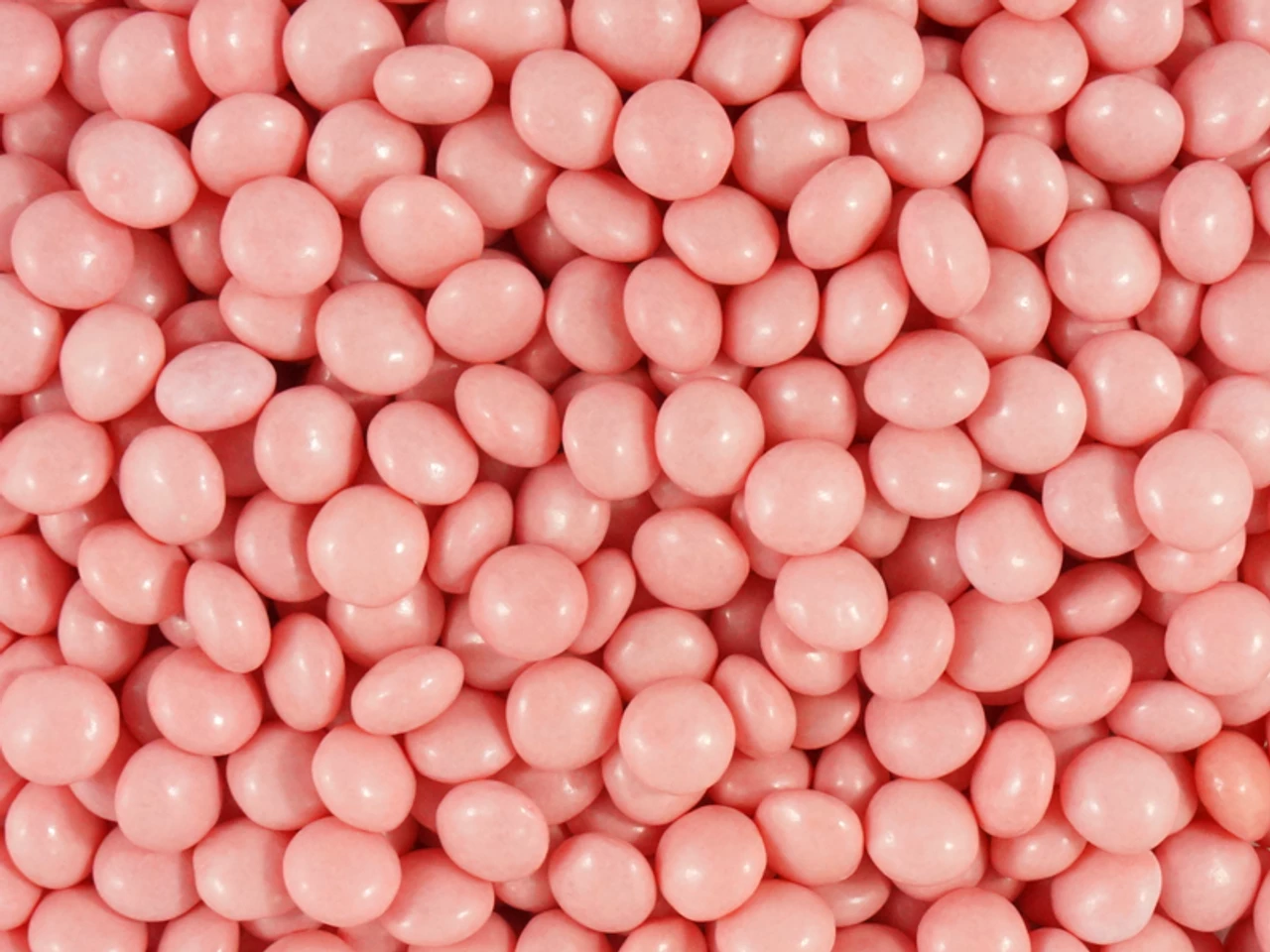 Candy Chews peach flavoured pink skittle like lolly. A 1kg bag of chewy sweet treats diameter approx. 1.25 cm. Ideal for parties, buffet or weddings.