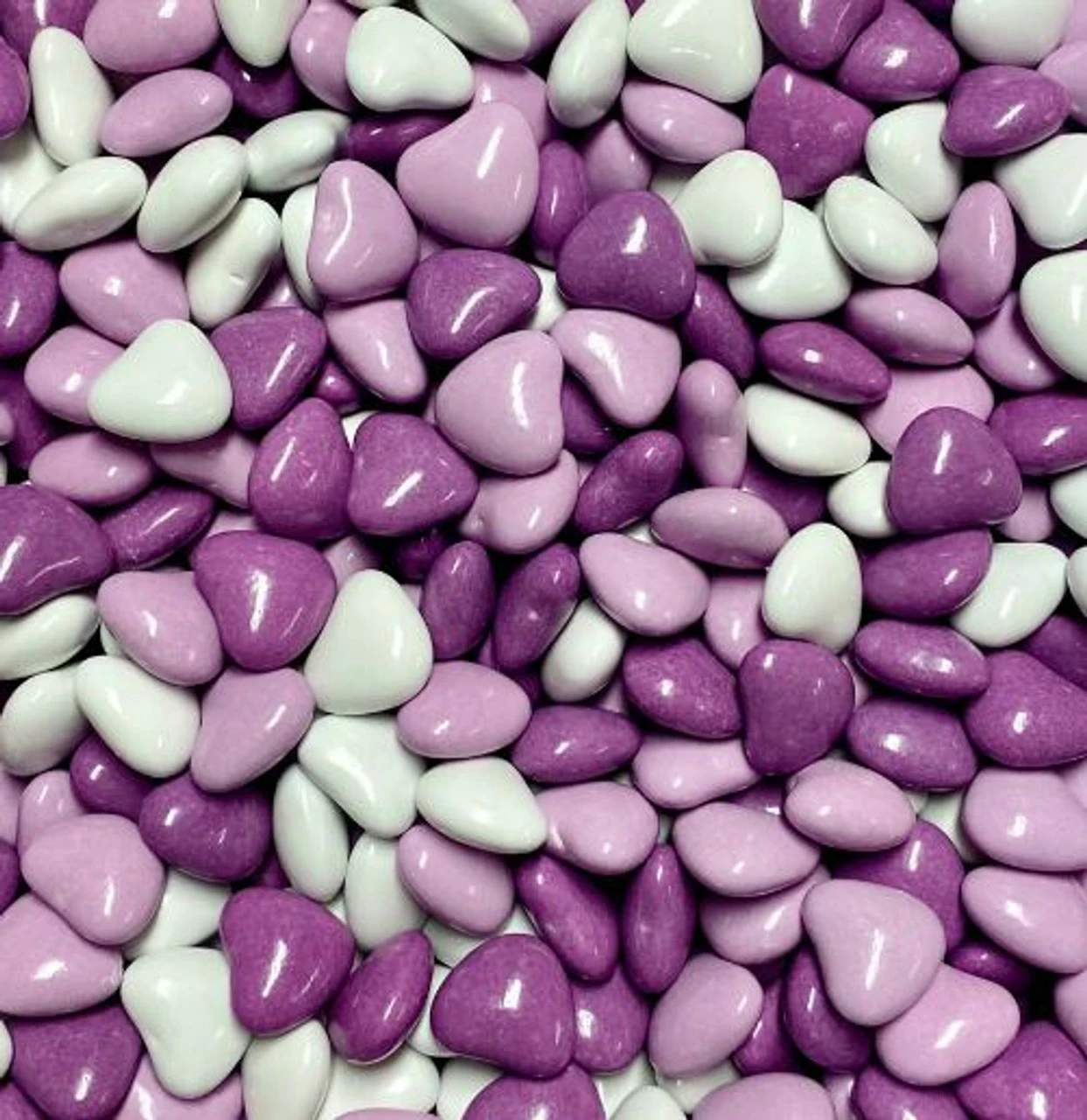 Candy Coated Purple Choc Hearts. Small purple, lilac or white candy coated heart shaped chocolate. 1kg bag. Ideal for Valentines day, Mother’s day, showers, buffet etc.