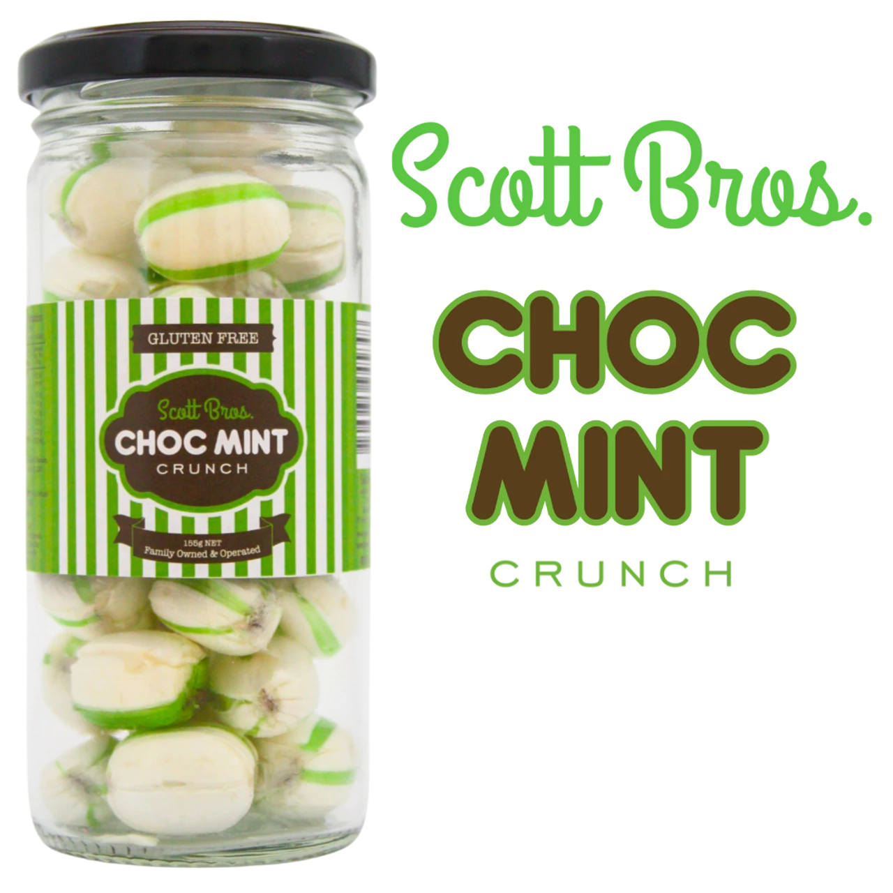 Choc Mint Crunch 155g are mint and chocolate flavours you remember and loved so well. Hard Candy. Made by Scott Bros. in a recylable glass jar to maintain the best possible freshness. Gluten Free. Made in Australia.