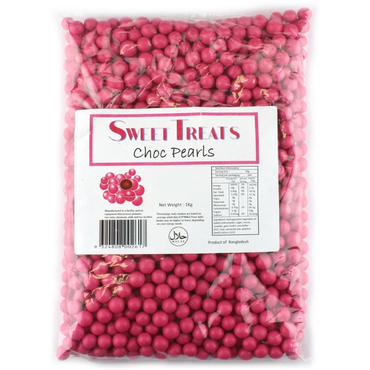 Choc Pearls Pink candy coated chocolate balls 1kg. Great for parties, weddings, lolly buffets and colour themes. Like small jaffas.Â