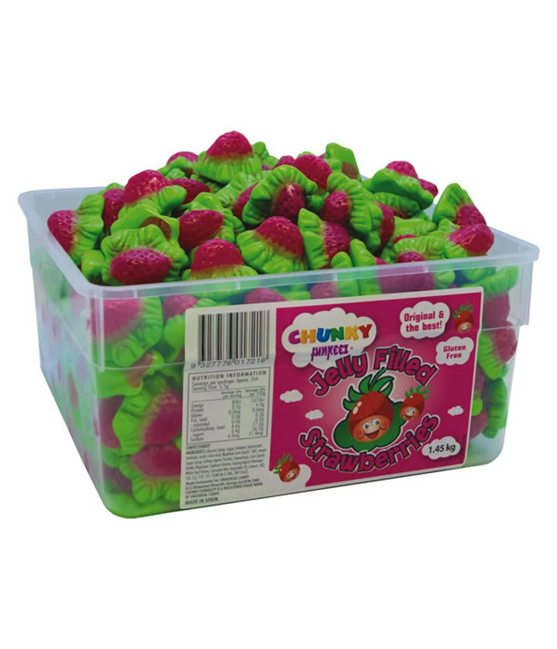 Chunky Funkeez Jelly Filled Strawberries are a multi-layered lolly with chewy gummy on the outside and soft jelly on the inside. 1.45kg tub. Ideal for buffet, party or event. Gluten free.Â