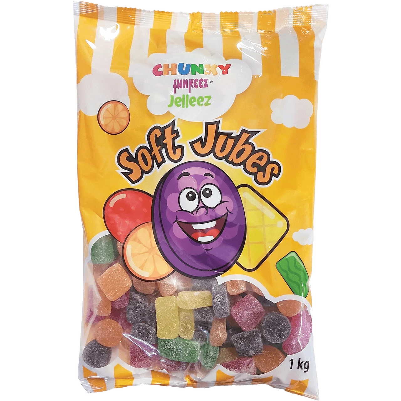 Chunky Funkeez Soft Jubes come in various coloured soft jelly jubes dusted in sugar. 1kg bag.