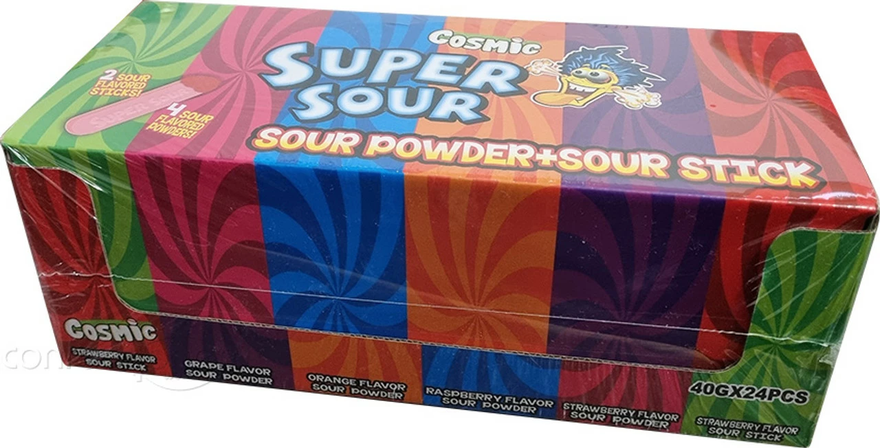 Super Sour Dip. 4 sour flavoured powders (grape, orange, raspberry, strawberry) + 2 sour flavoured sticks. 24 x 40g pieces. CosmicÂ