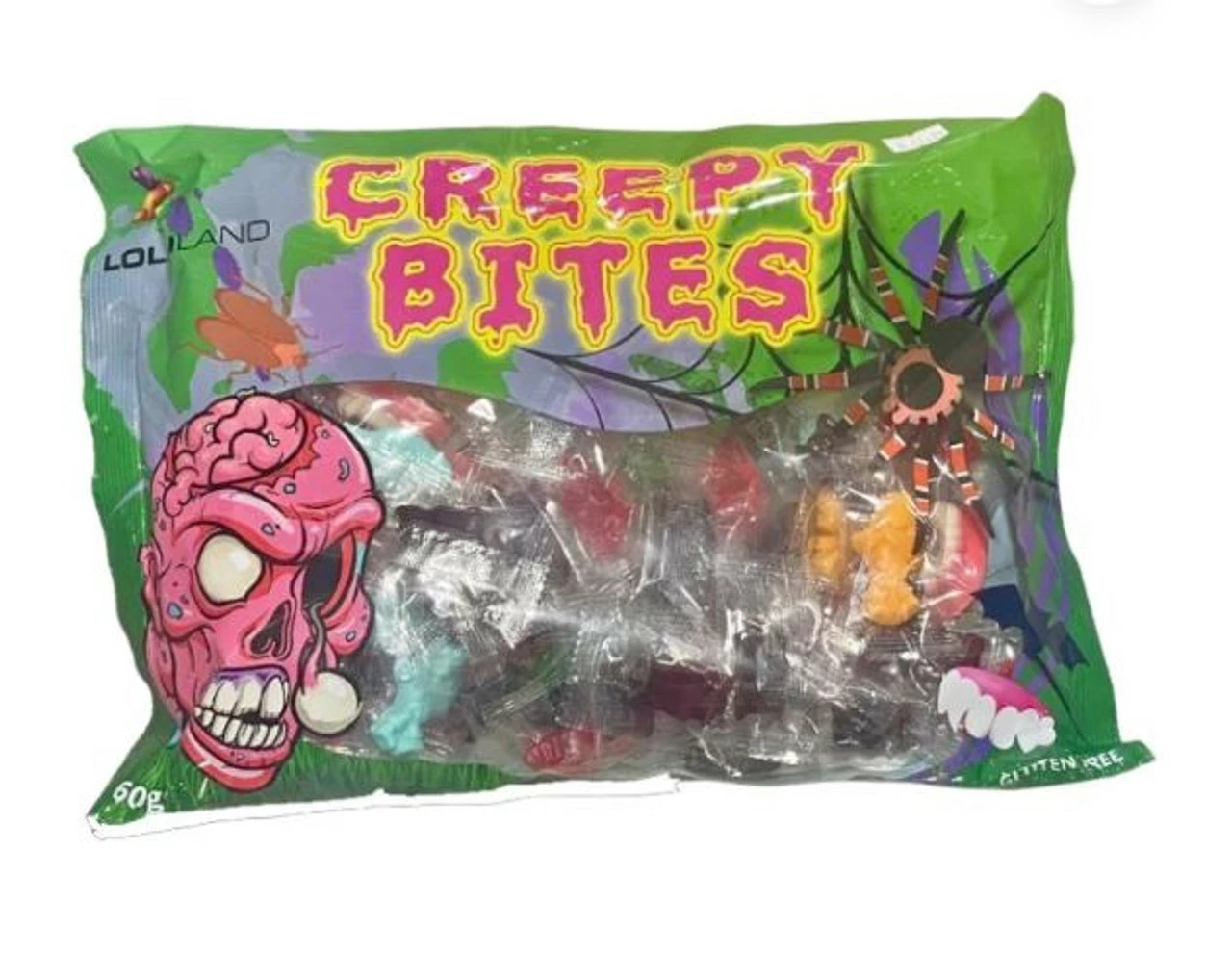 Creepy Bites, Gruesome individually wrapped gummi monsters and insects perfect for trick or treating. Spiders, zombies,cockroaches, fangs, bats. Ideal for halloween, Approx. 85 pieces in a 600g bag. Gluten free.