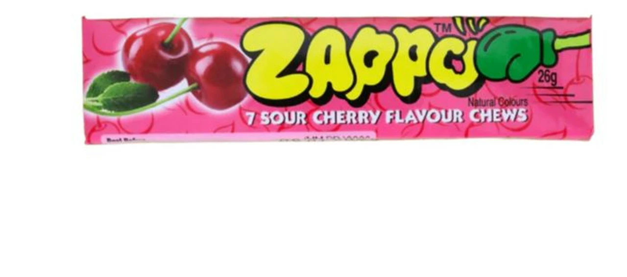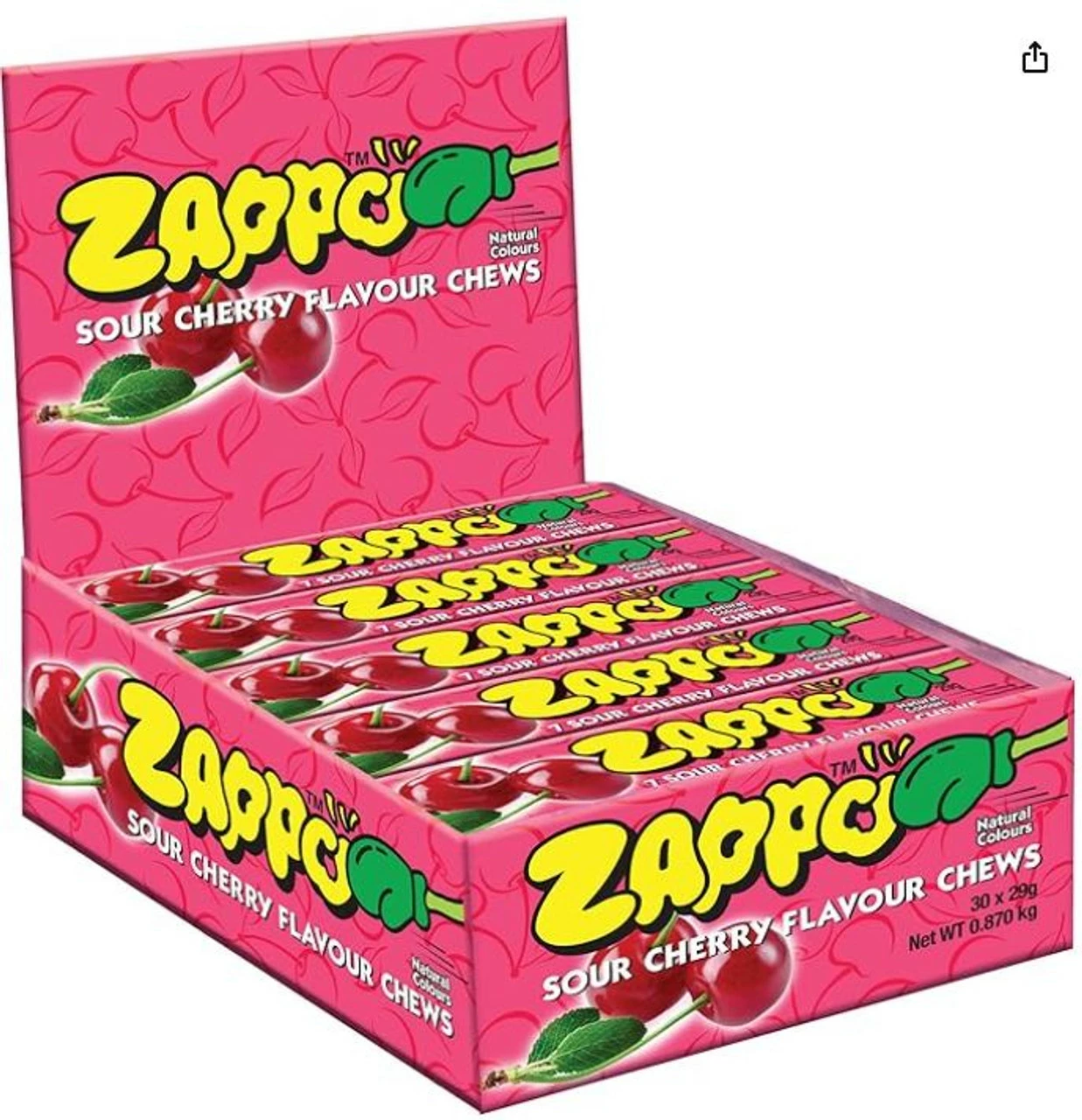 Sour Cherry flavoured Zappo chews . 30 x 29g in each box. Kids absolutely love these.