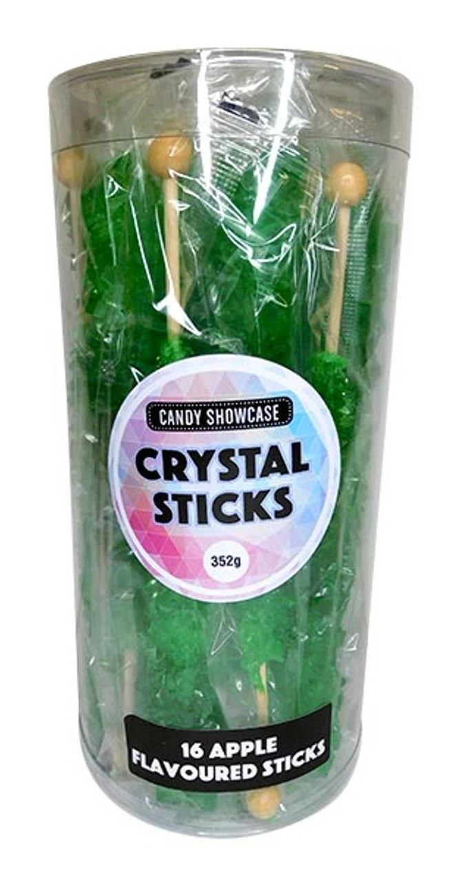 Crystal Sticks. 16 apple flavoured green crystal swivel sticks. 352g. Ideal candy for buffet, wedding, parties. Gluten free. Individually wrapped.
