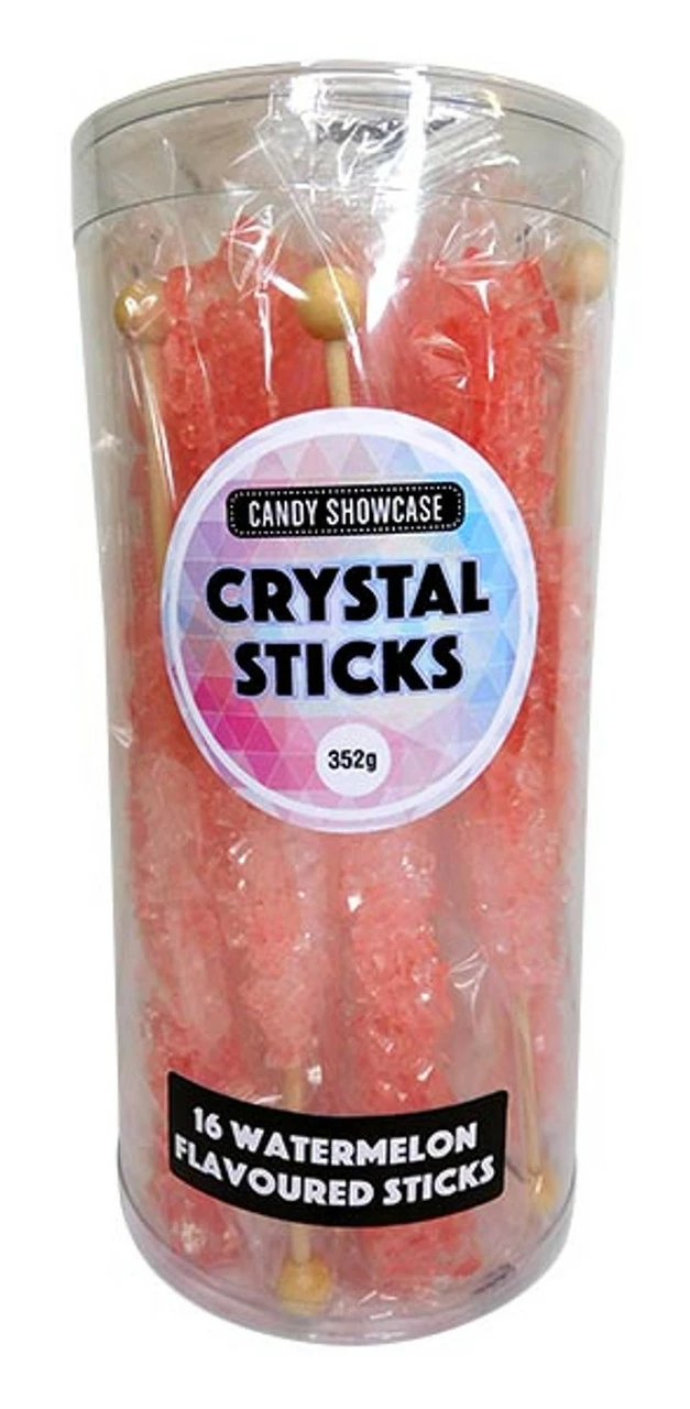 Crystal Sticks. 16 watermelon flavoured light pink crystal swivel sticks. 352g. Ideal candy for buffet, wedding, parties. Gluten free. Individually wrapped.