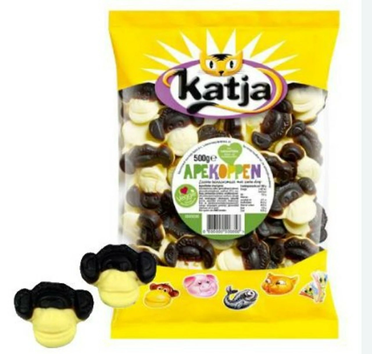 Dutch Katja Apekoppen Banana Monkies are soft licorice monkey face in a 500g bag. Product of Netherlands.