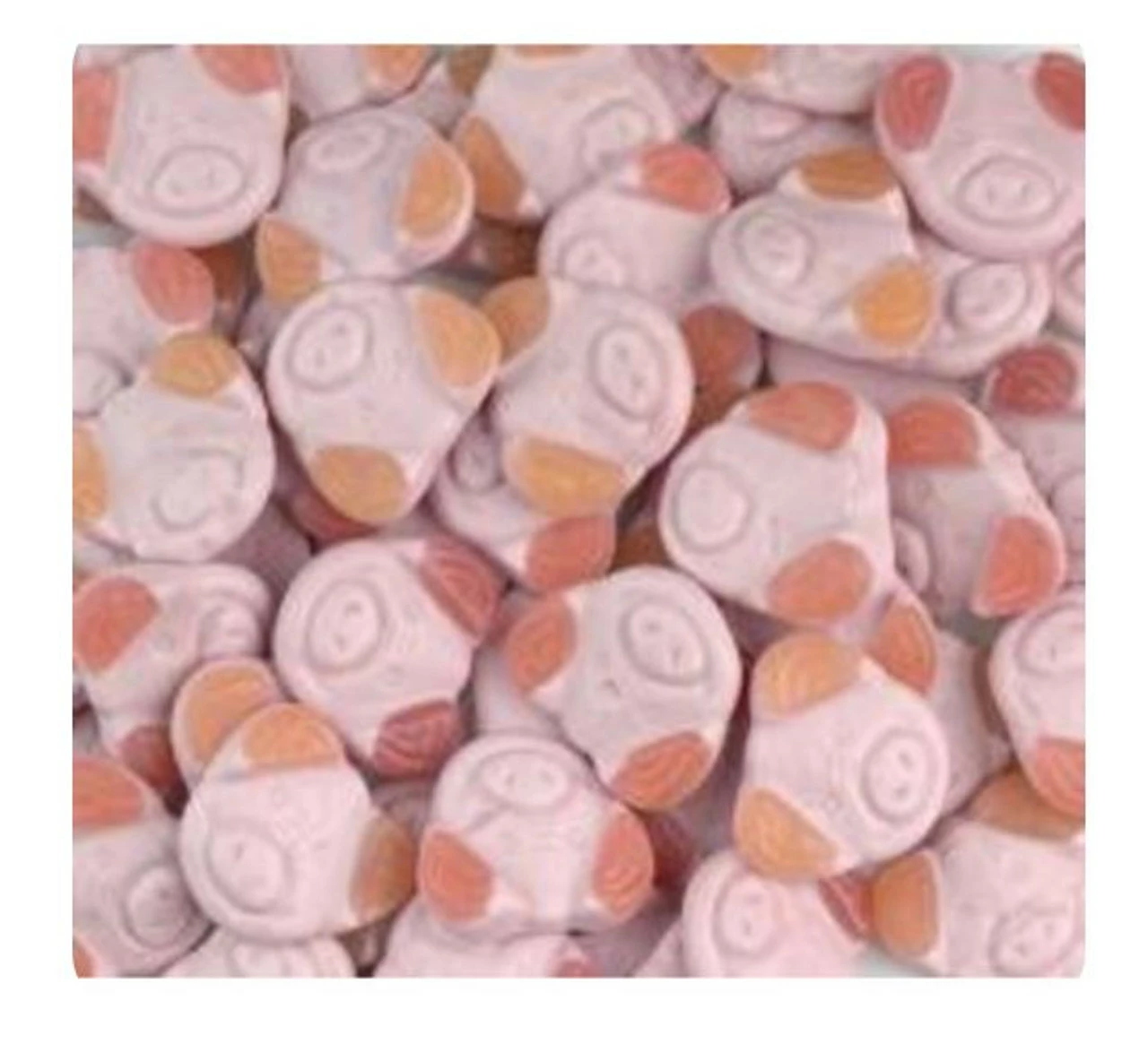 Dutch Katja Biggetjes Pigs are a soft fruit gums. Pink pig shaped head. 500g bag. Product of Netherlands.