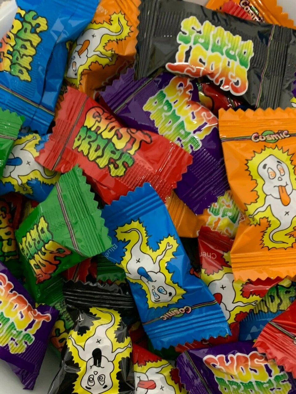 Ghost Drops are a hard candy in bright colours that makes your mouth change colour. Cosmic ghost drops come in approx. 240 individually wrapped lollies. Great for Halloween.
