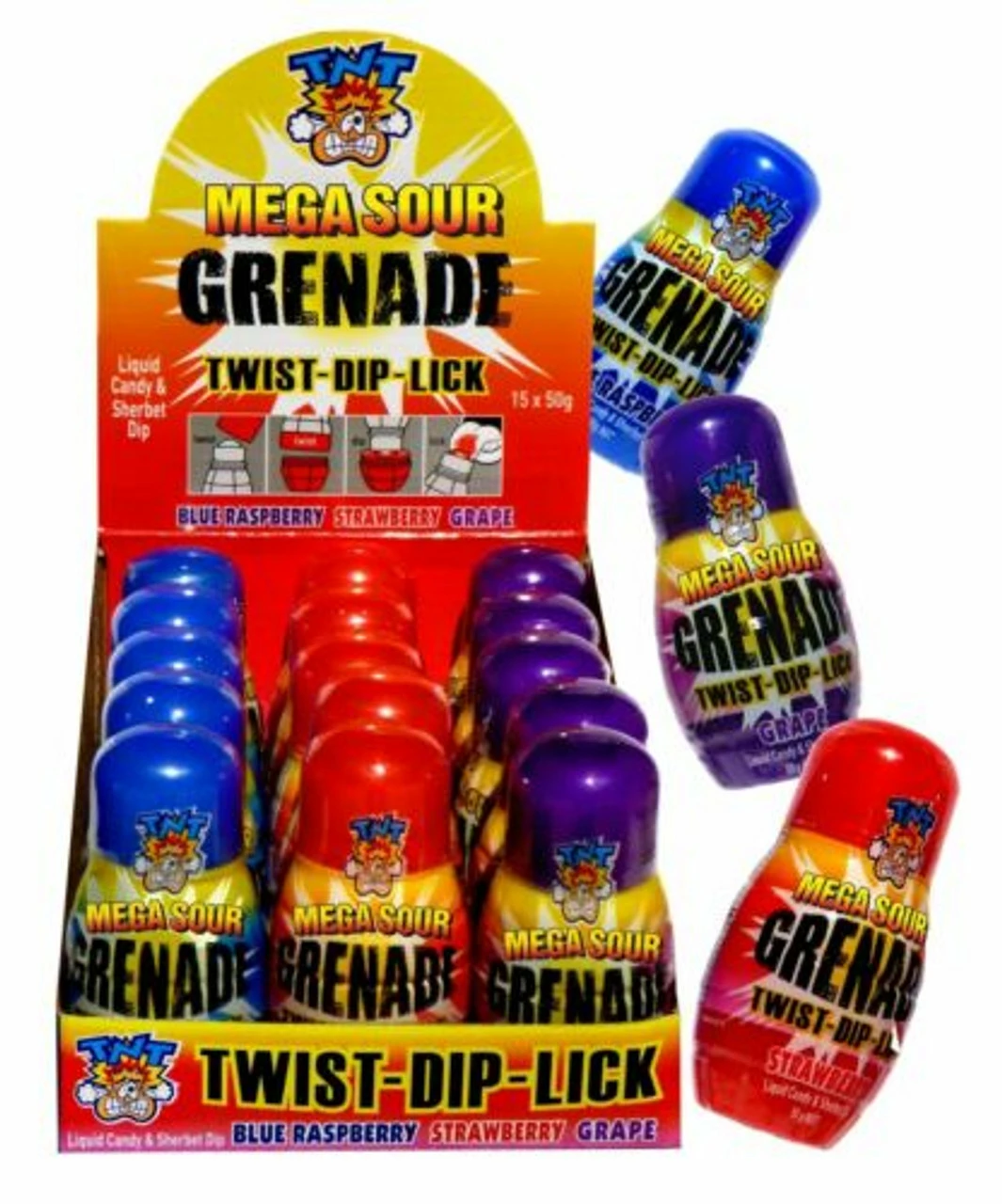 Grenade Mega Sour. Liquid candy and sherbet dip. Twist, lick, dip. Blue raspberry, strawberry, grape. 15 x 50g grenades. Gluten free, Individually wrapped. TNT