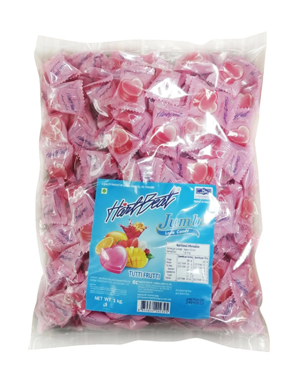 Hartbeat Tutti Frutti Jumbo love candy. Each bag contains approx. 165 individually wrapped jumbo pieces of heart candy.Â