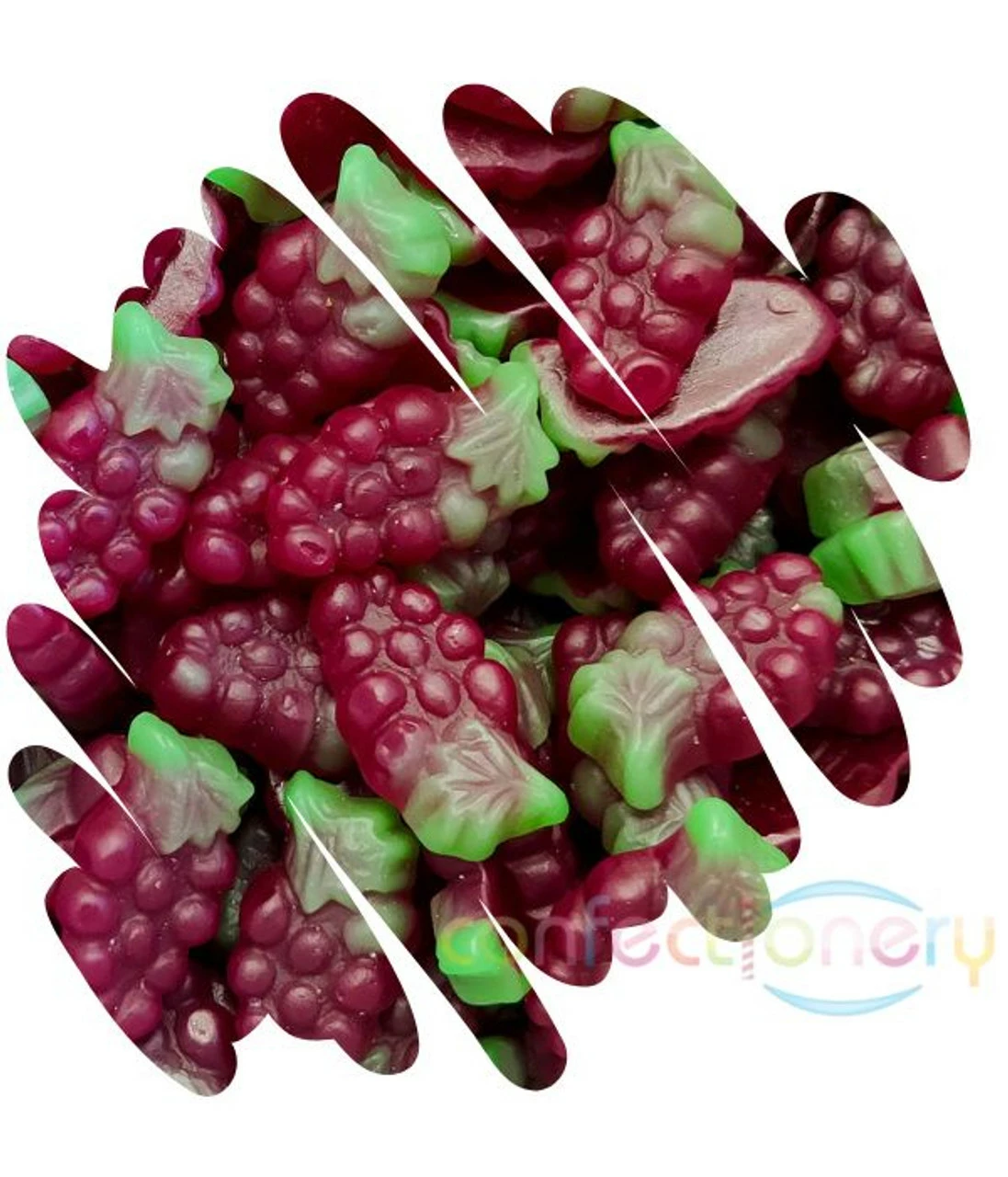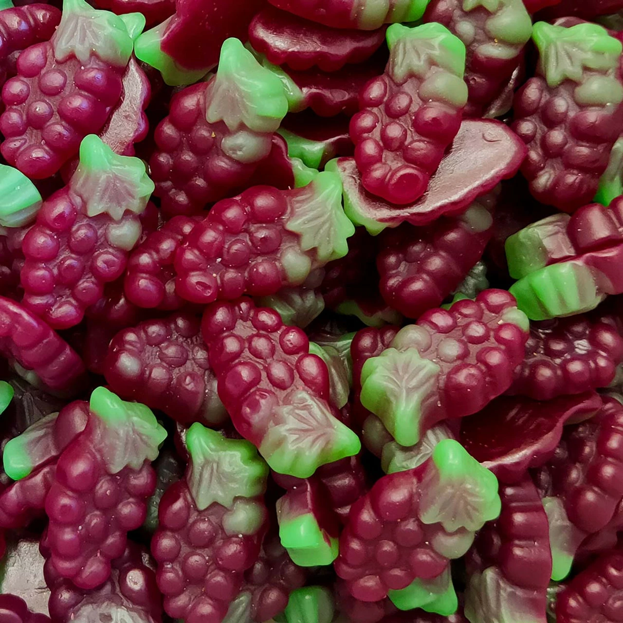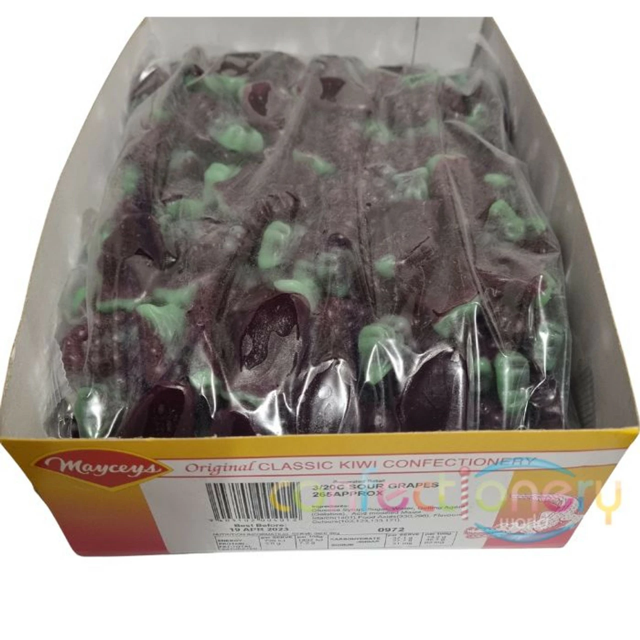 Mayceys Sour Grapes soft sour lolly. Each box contains roughly 265 loose Sour Grapes and the box weighs 1.7kg. Made in New Zealand by Mayceys Confectionery.