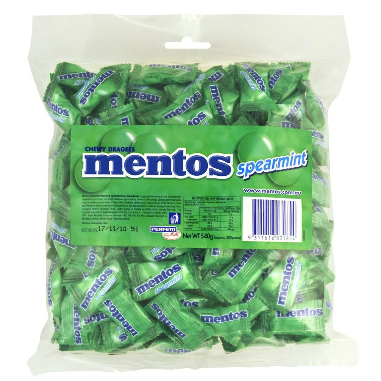 Mentos Spearmint Pillowpack is a bulk bag of individually wrapped pieces of spearmint Mentos. Approx 200 in each 540gm bag.  Perfect for parties, hotels, motels, waiting rooms, reception desks, conferences etc.