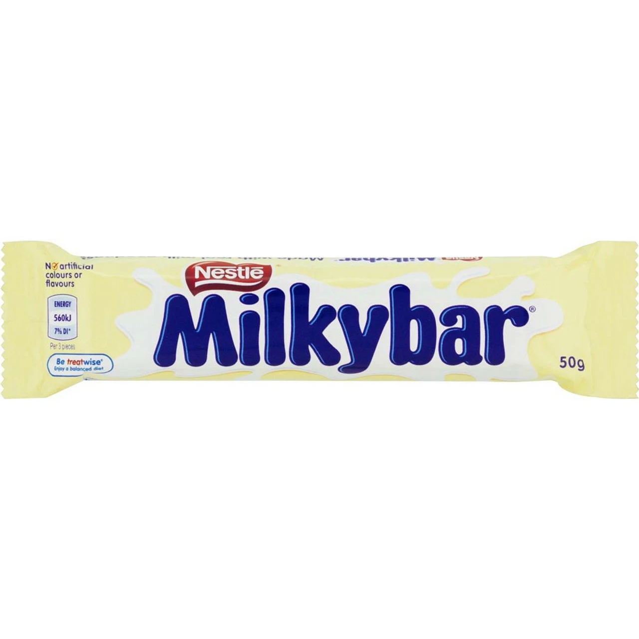 Nestle Milky Bar is a white chocolate bar full of pure milk goodness. (50g x 36 bars in a Display Unit). This creamy delight that melts in the mouth is made with real milk goodness.