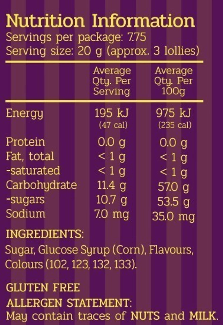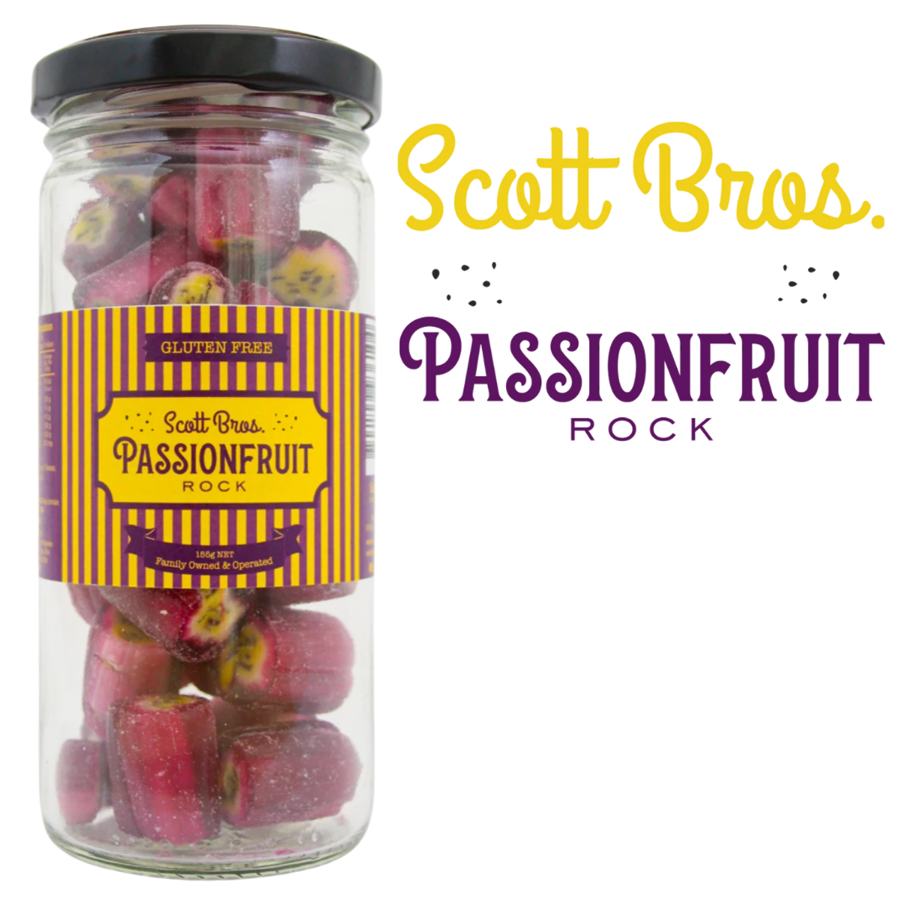 Passionfruit Rocks 155g are purple and yellow sweet flavoured candy you remember and loved so well. Hard Candy made by Scott Bros. Packed in a recylable glass jar to maintain the best possible freshness. Gluten Free. Made in Australia.