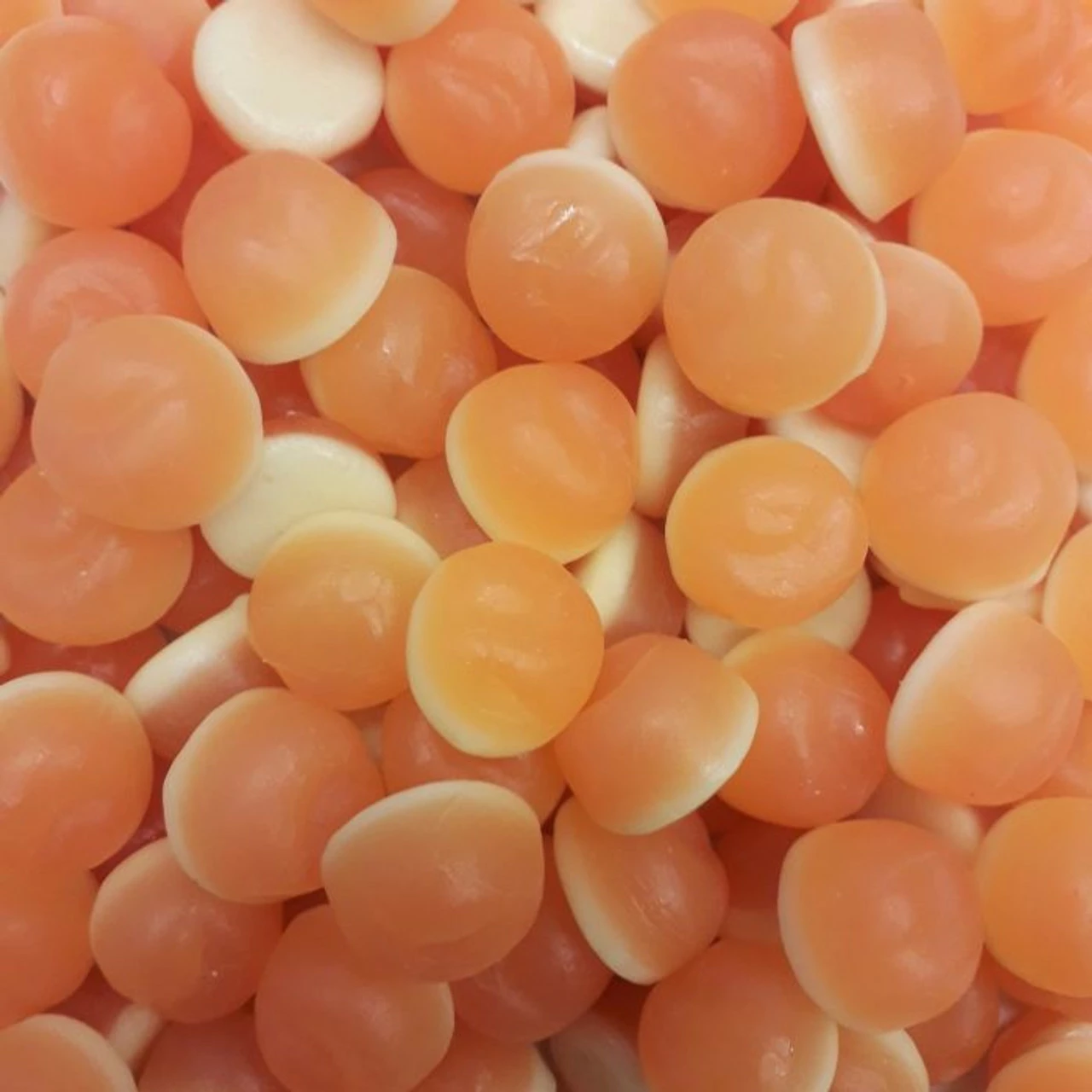 Peaches n Cream. 1kg bag. A peach flavoured gummy with a cream backing. Made in New Zealand by Rainbow Confectionery. Gluten Free.