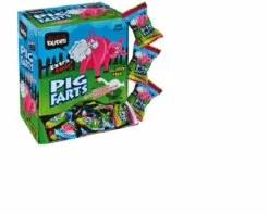 Pig Farts are extra sour tutti frutti flavoured liquid filled Bubblegum. Rude Dudes Pig Farts are gluten free and individually wrapped with each box containing approximately 200 pieces.