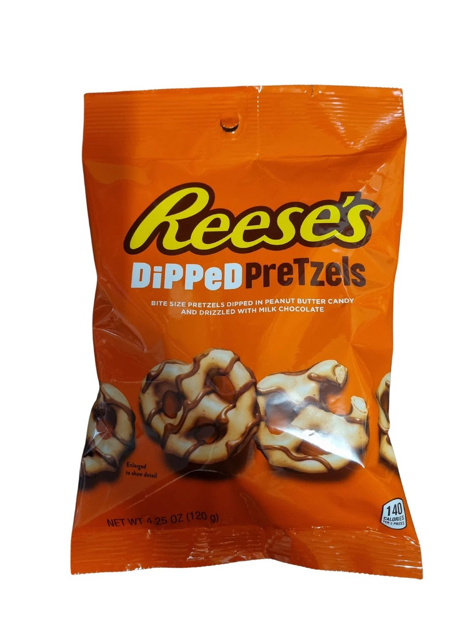 Reese’s Dipped Pretzel. Bite size salty pretzels dipped in peanut butter candy and drizzled with milk chocolate. 120g bag. Hersheys Reeses USA.Â