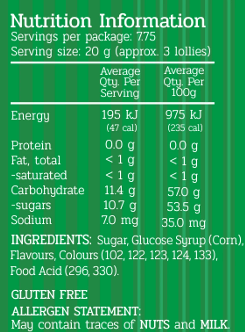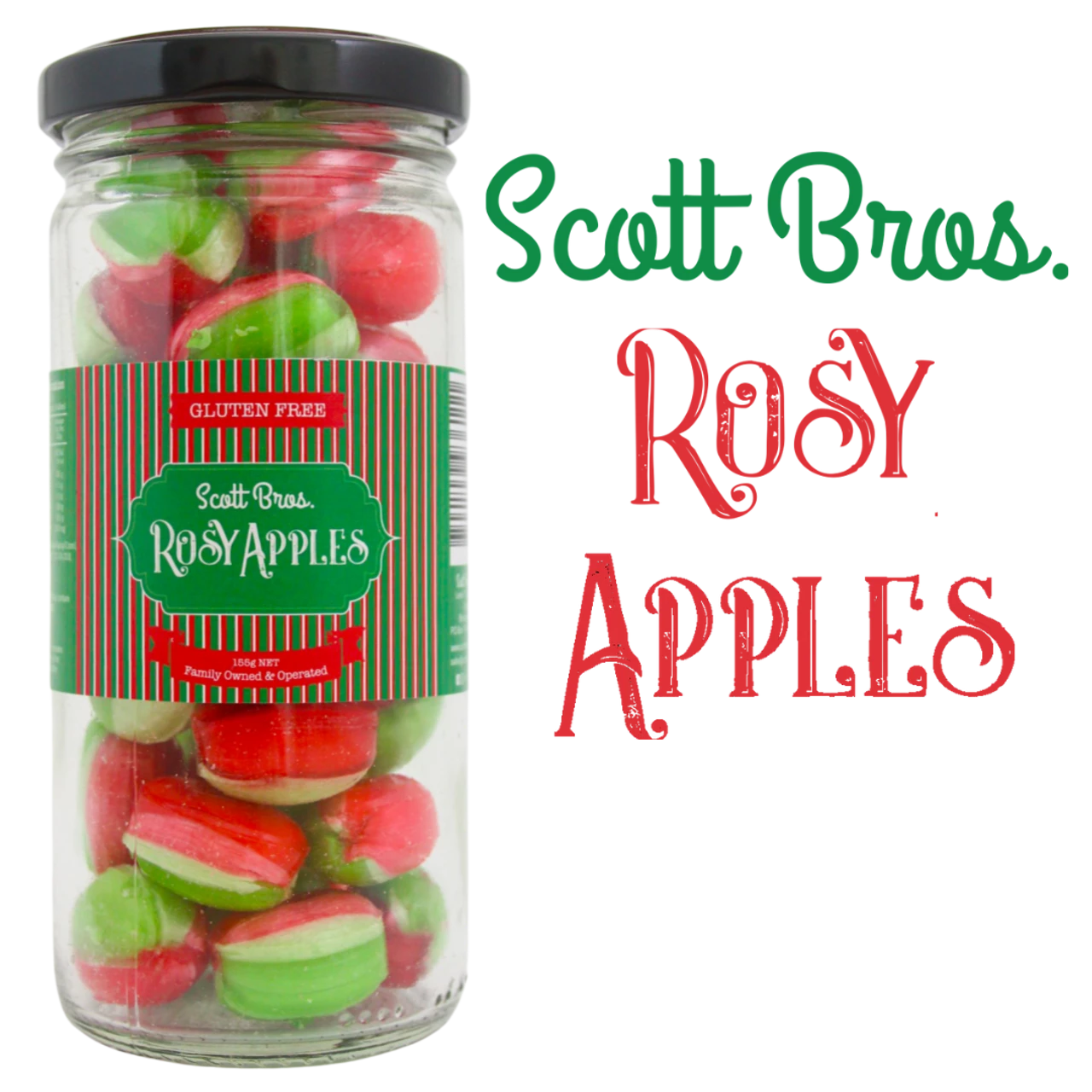 Rosy Apples 155g are an old fashioned Rosy Apple flavoured hard candy. Lollies are in a recylable glass jar to maintain the best possible freshness. Gluten Free. Made in Australia by Scotts Bros.