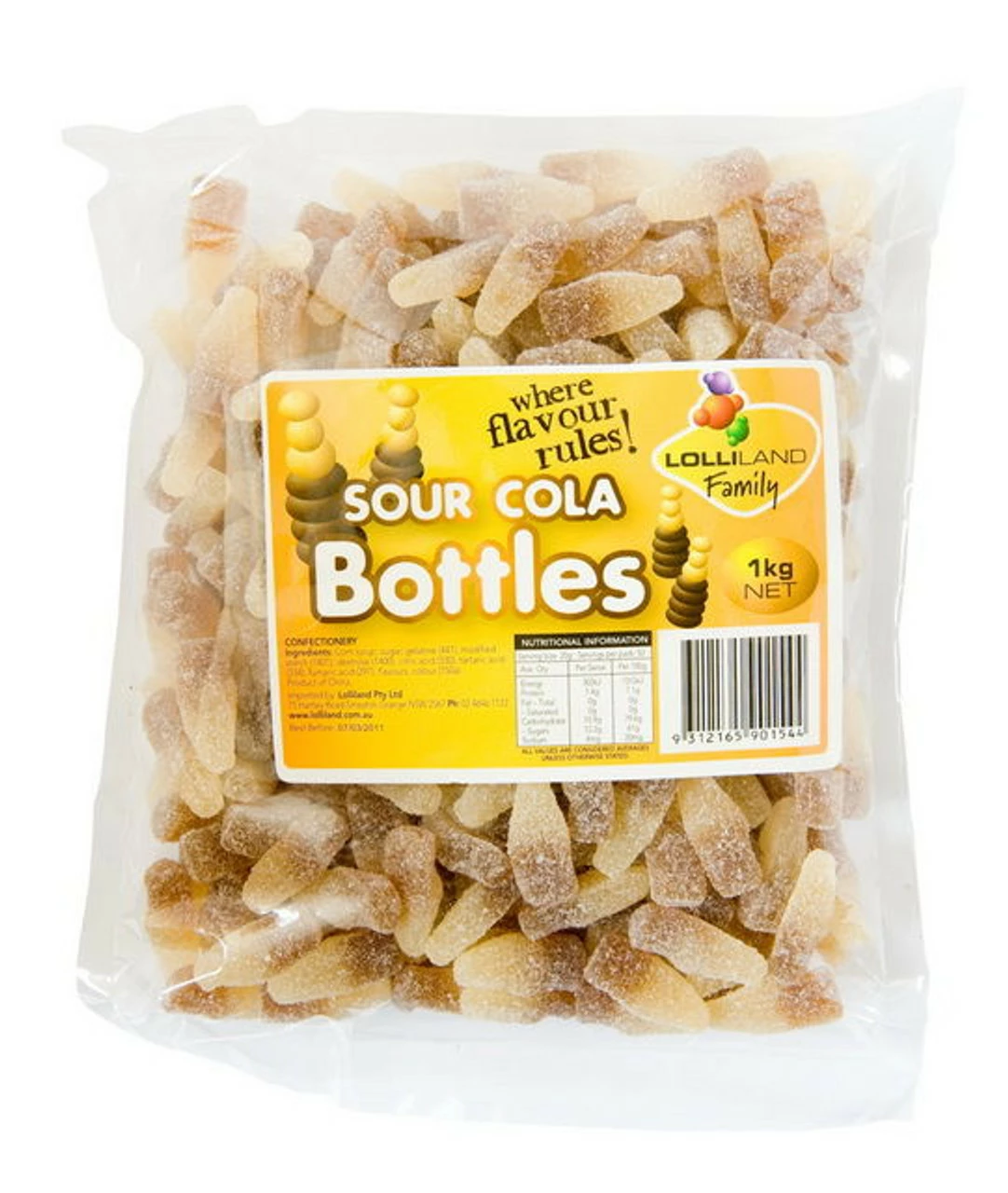 Sour Cola Bottles a selection of soft jelly sweets. Gluten free. A 1 kg bag. Ideal for parties, buffets and events.
