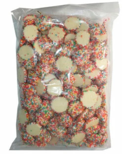 White chocolate buds with a rainbow of coloured speckles sprinkled over each jewel. Ideal for a party, buffet or wedding. Multi-coloured Choc freckle like speckle in a 1kg bag.