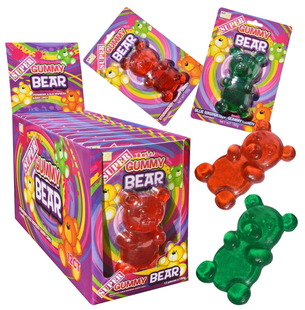 Super Gummi Bears. A super-sized, strawberry and blue raspberry flavored gummy candy, in the shape of bear. 12 x 150g individually wrapped bears per box. Approx. 13 cm.