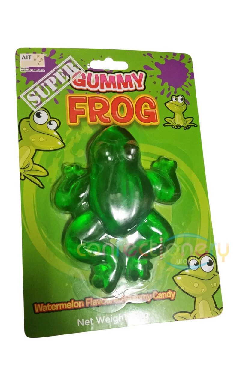 Super Gummi Frog. A super-sized, watermelon flavoured gummy candy, in the shape of frog. Green frog. 150g individually wrapped frog. Approx. 14 cm high.