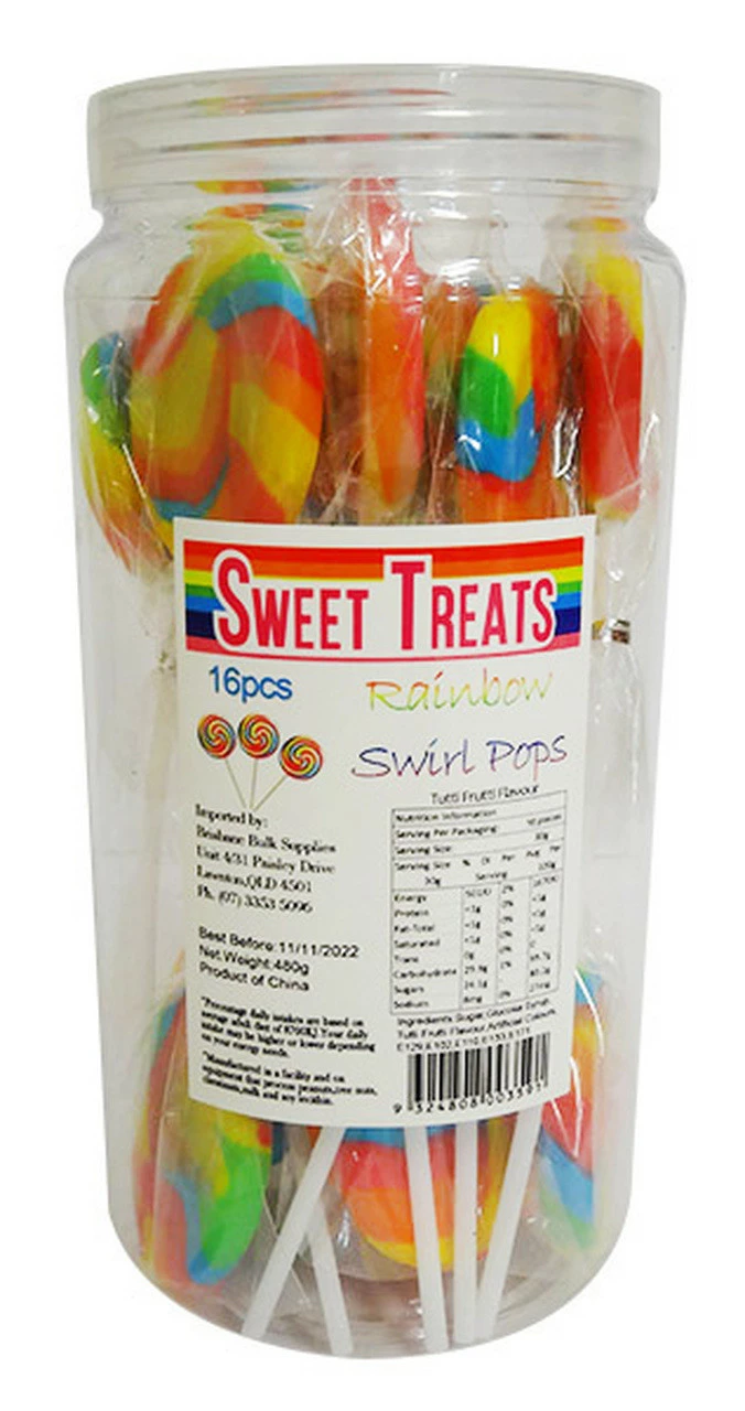 Rainbow swirly pops have 16 swirl lollipops in a jar. Tutti frutti flavour. Each lollipop weighs approx. 30g. and measures approx. 6cm diameter (with stick 13.5cm in total length). Perfect for baby shower, parties, candy buffets.