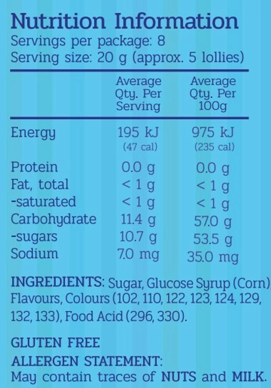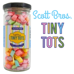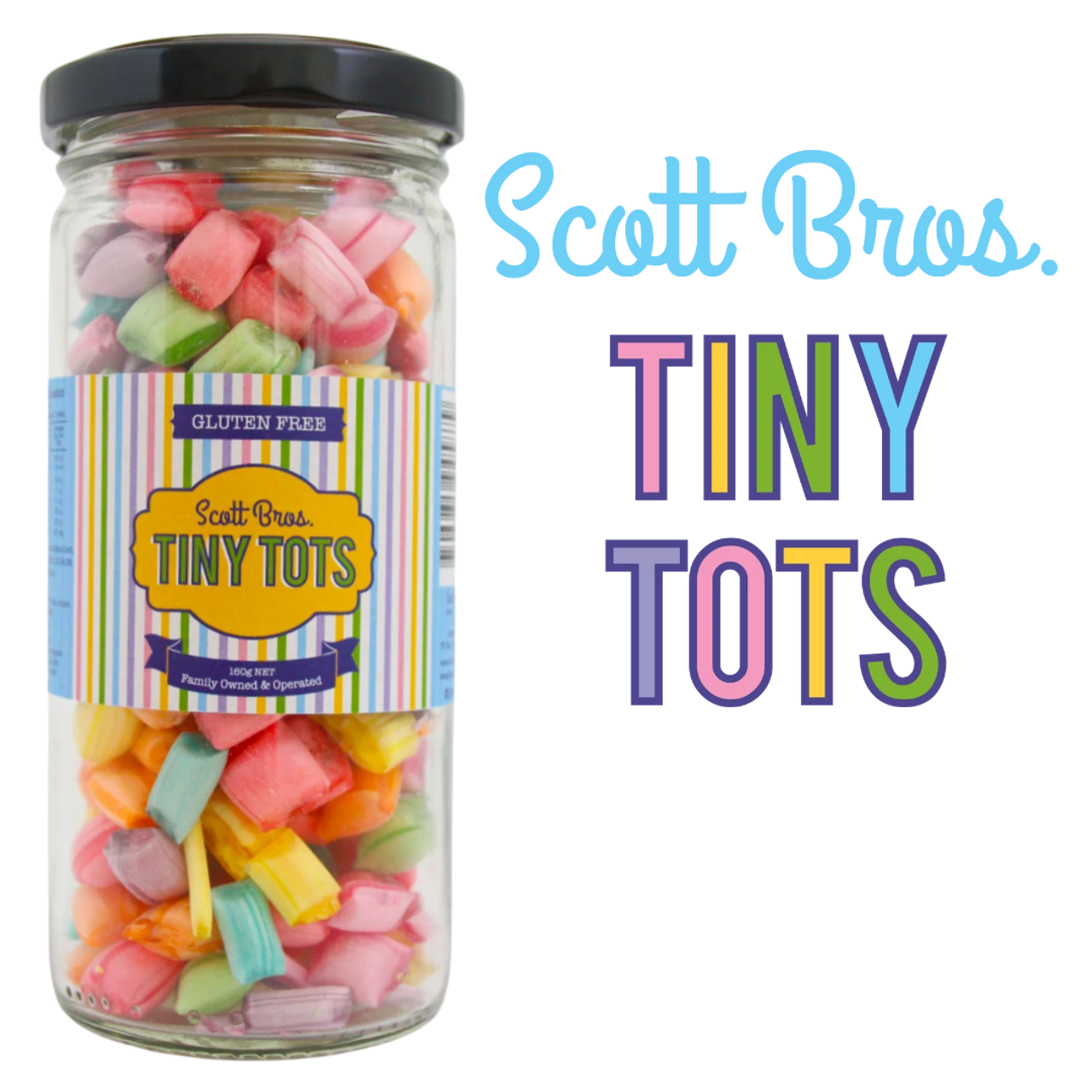 Tiny Tots 160g are an assorted colour and flavoured little square pillows (also known as Bo Peeps). Lollies are in a recylable glass jar to maintain the best possible freshness. Gluten Free. Made in Australia by Scotts Bros.