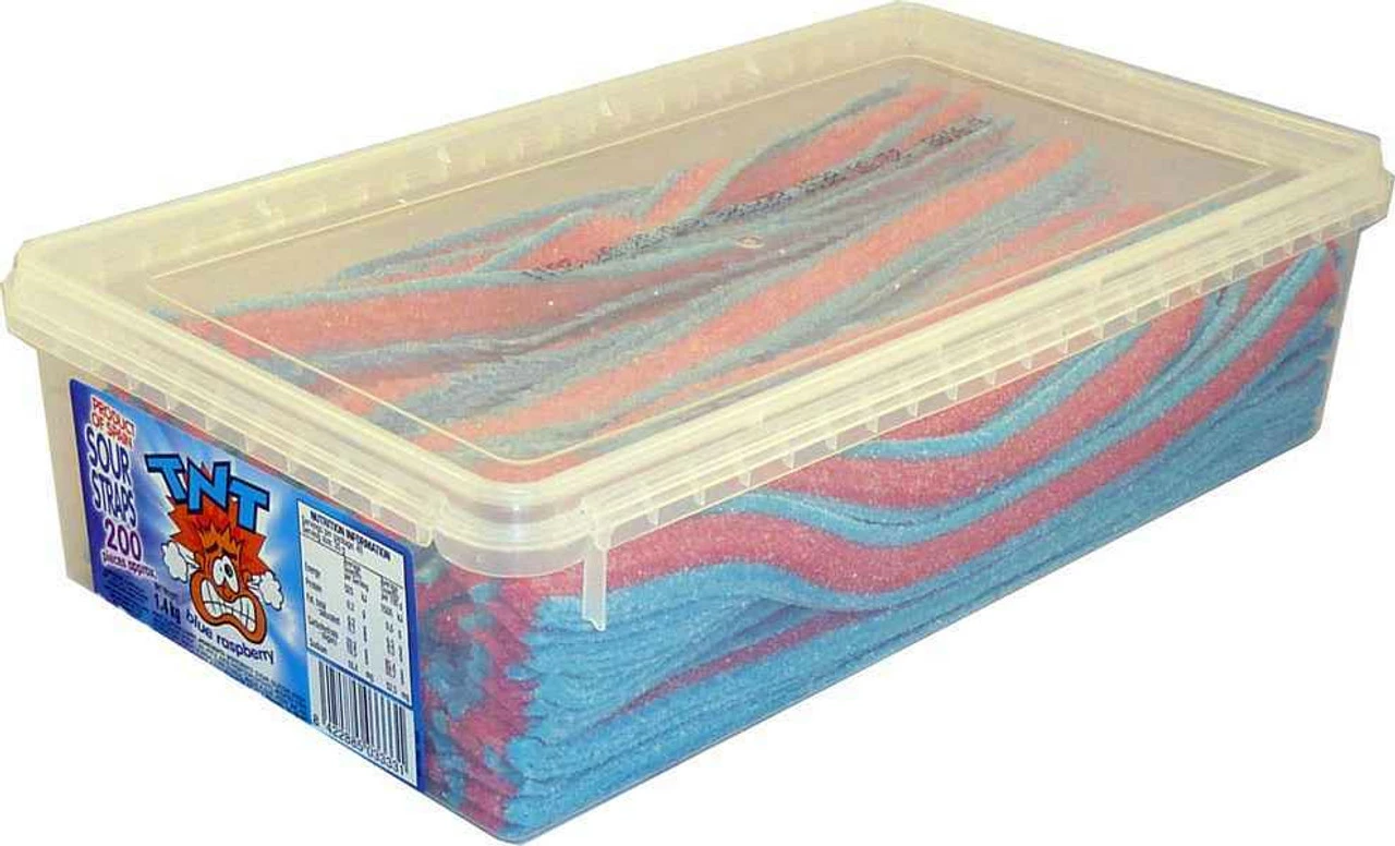 Hugely Popular AIT TNT Sour Straps. Blue Raspberry in flavour and approx. 200 pieces per container. Made in Spain.