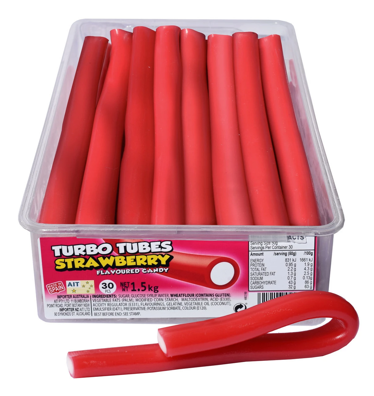 TNT Strawberry oiled turbo tubes are chewy white tube surrounded by a red ribbon.1.5 kg or approx 30 pieces in every box. Made in Spain.