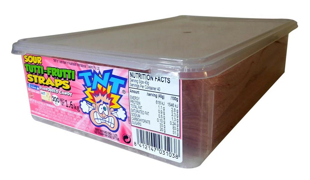 TNT Tutti Frutti Sour Straps. Tutti frutti flavour. Sour straps are a flat ribbon of sour candy with a coating of sugar. 1.6 kg or approx 200 straps in every box.