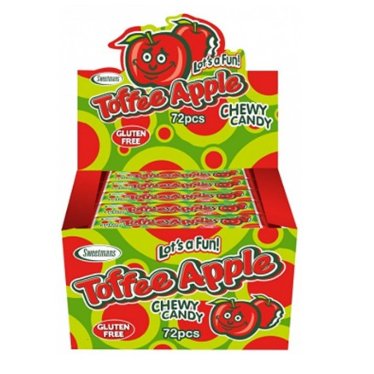 Toffee Apple Chews Sweetmans. A yummy delicious chew bar with a toffee apple flavour. Ideal for party bag fillers, birthdays and themes. 72 individually wrapped chews per box. Gluten free.