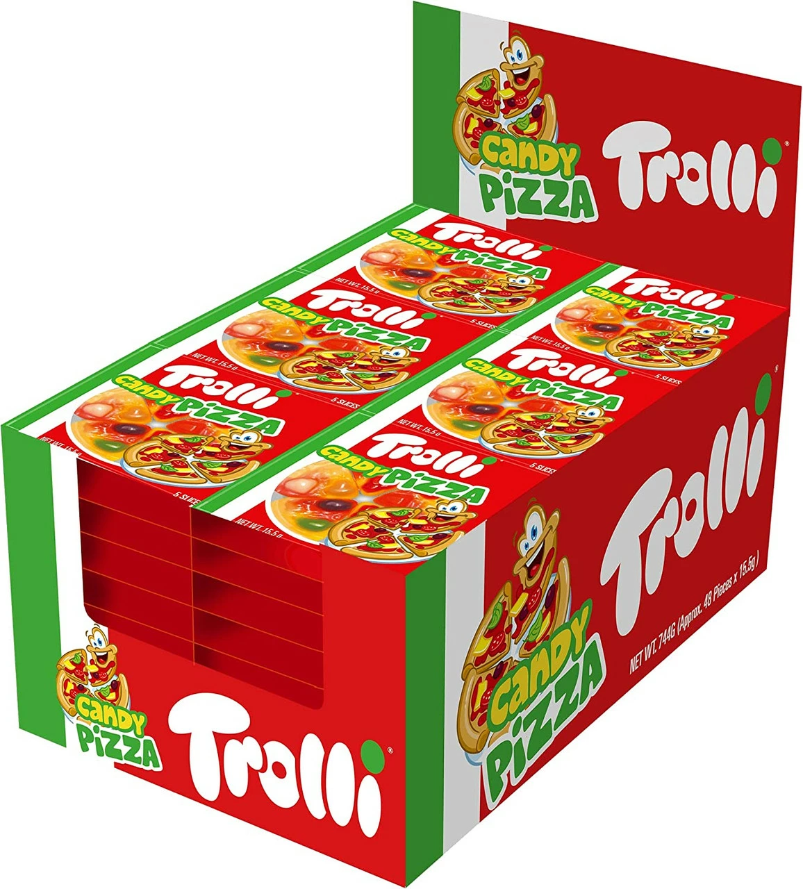 Trolli Gummi Pizza. 5 Slices in every pizza. Approximately 48 x 15.5g pizzas in every box.