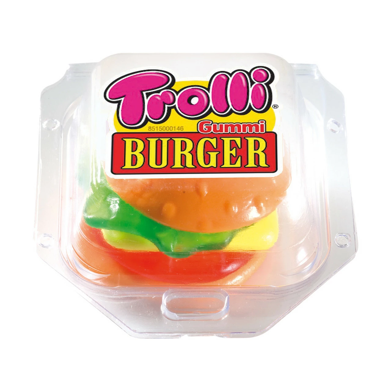 Trolli Mega Burger. 24 x 50g mega burgers in every box. Fruity, jelly shaped sweet and chewy Gummi Burger.