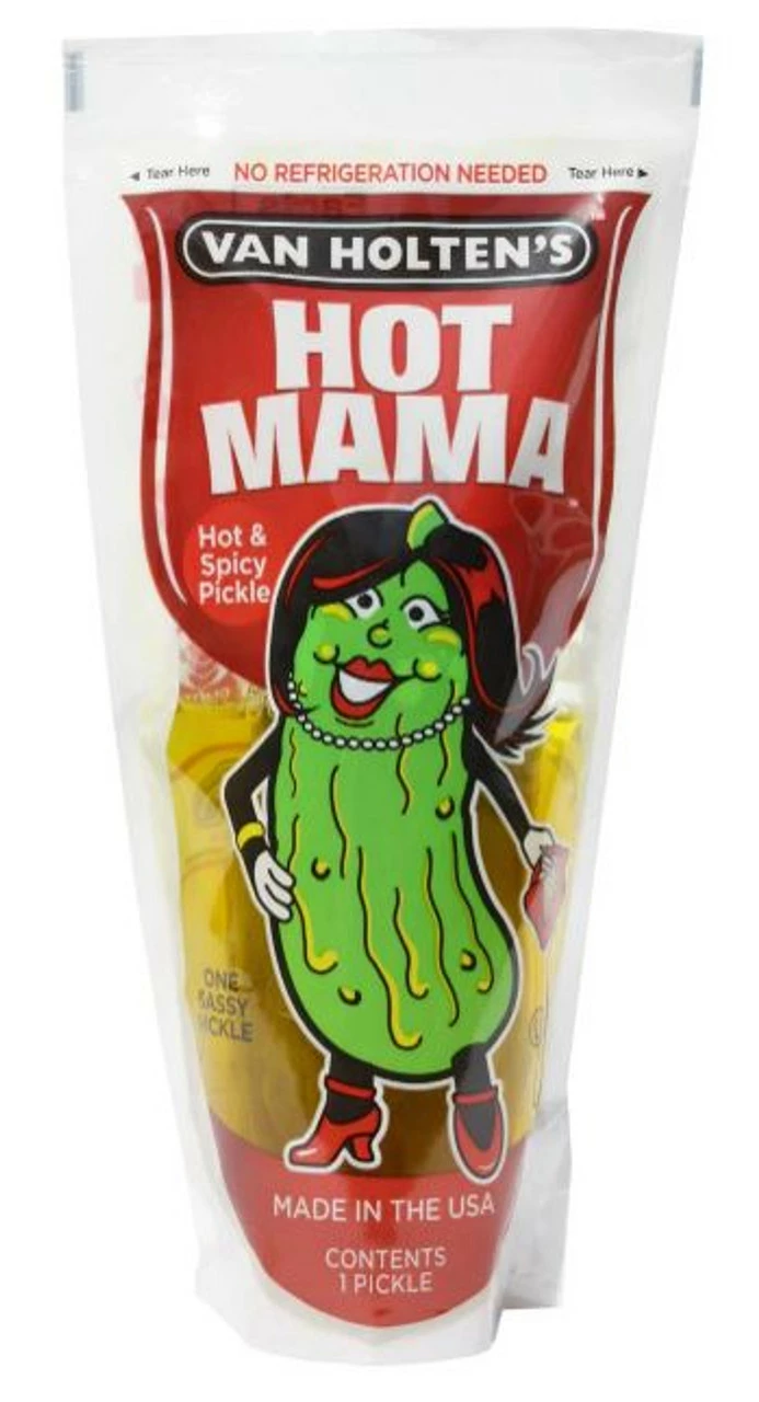 Van Holten’s Hot Mama Pickle. Our “Sassy” hot and spicy pickle. One large pickle per bag. Made in USA. No refrigeration needed. Gluten Free.