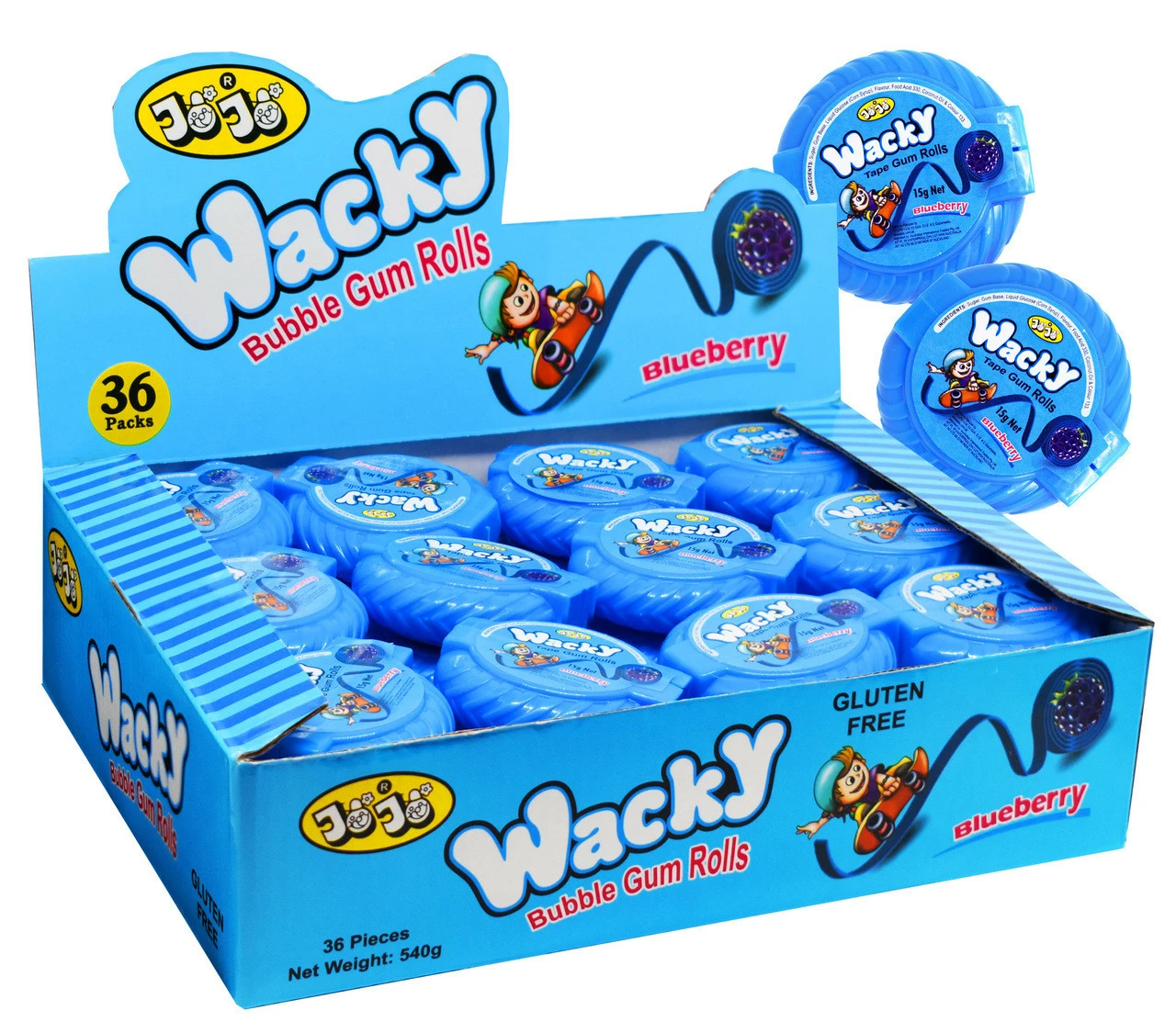 Wacky Bubble Gum Rolls Blueberry. 36 x 15g tapes of bubblegum. JoJo. Gluten free.Â