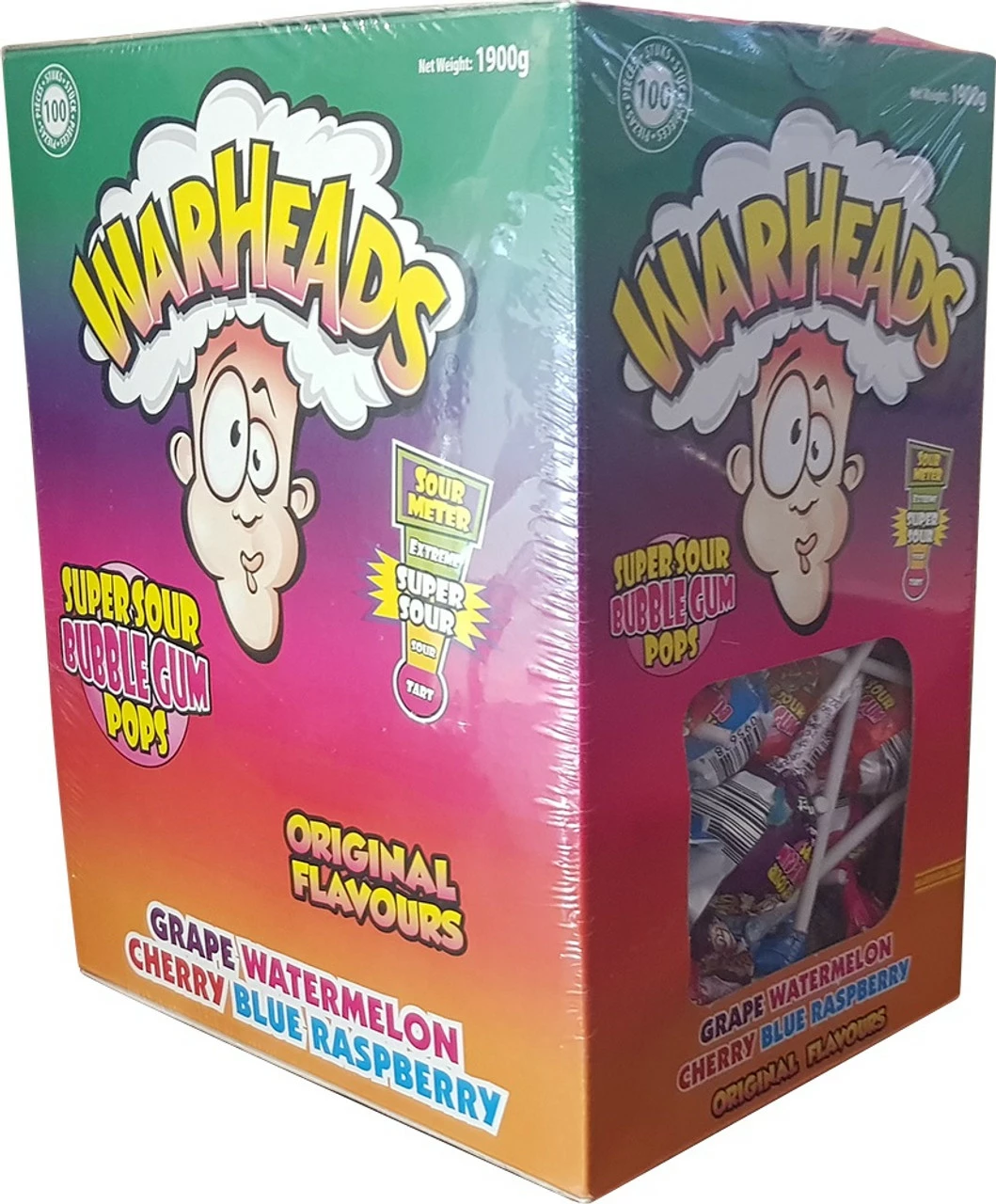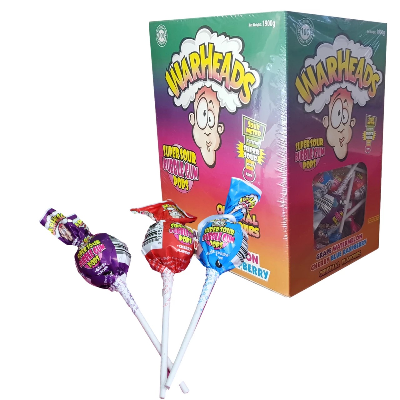 Warheads Super Sour Bubblegum Pops. Lollipop filled bubblegum. Assorted flavours – grape, watermelon, cherry, blue raspberry. Approx 100 pieces x 19g. No artificial colours.