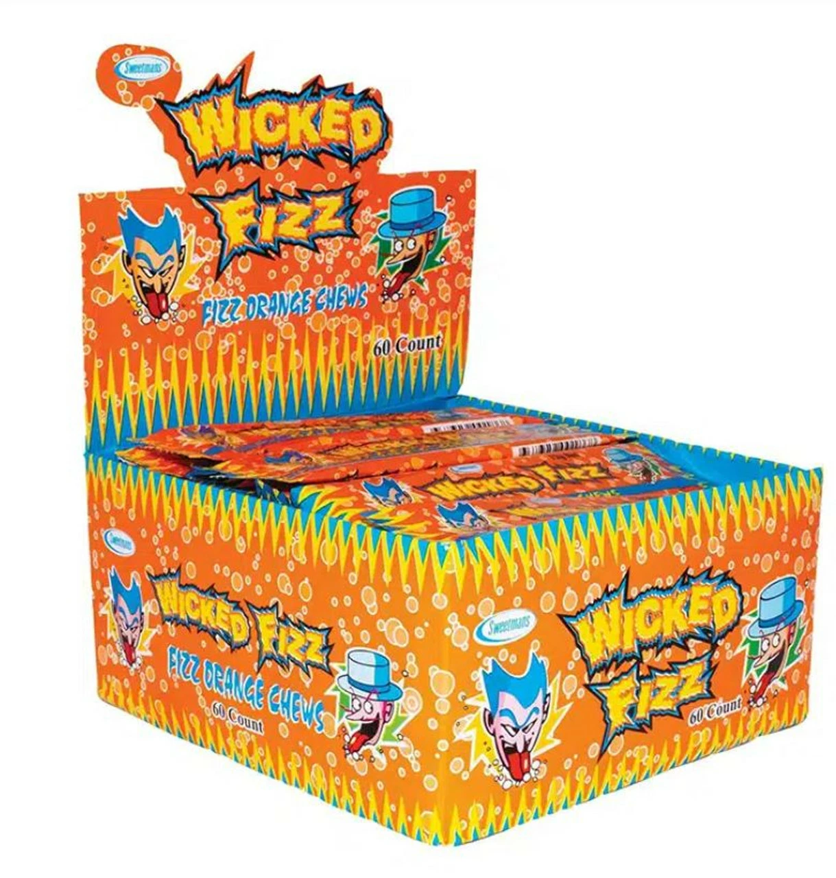Wicked Fizz Orange Chews. A yummy delicious chew bar with an orange flavour. Ideal for party bag fillers, birthdays and themes. 60pc in a box.
