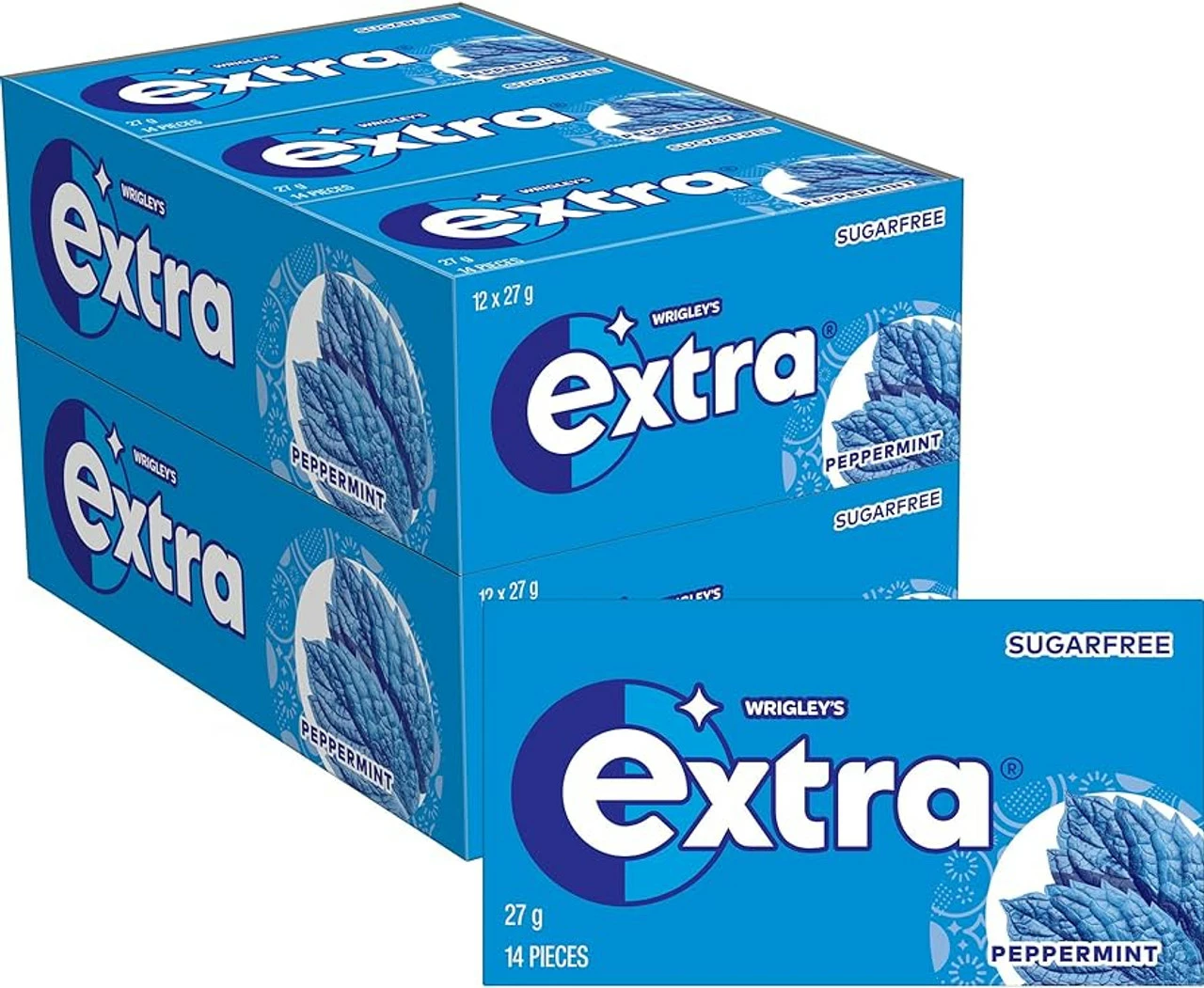 Wrigleys sugar free gum in peppermint flavour. There are 24 x 27g envelopes per box and there are 14 pieces of gum per envelope.