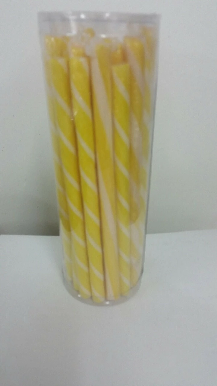 Yellow Candy Poles are sticks of lemon flavoured yellow and white striped candy. Each individually wrapped pole is approx. 18 cm long. Ideal for buffets, parties or weddings. (30 x 18g)